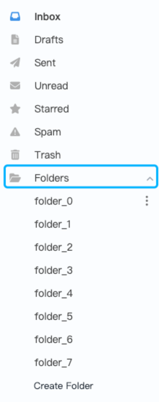 在通过用户后台/网页版本登录进入邮箱后,在界面左侧可以看到最下方的Folders菜单案件,此时可以点击右方的下拉按键,此处将有8个未命名文件夹,以及一个创建邮件夹按钮。