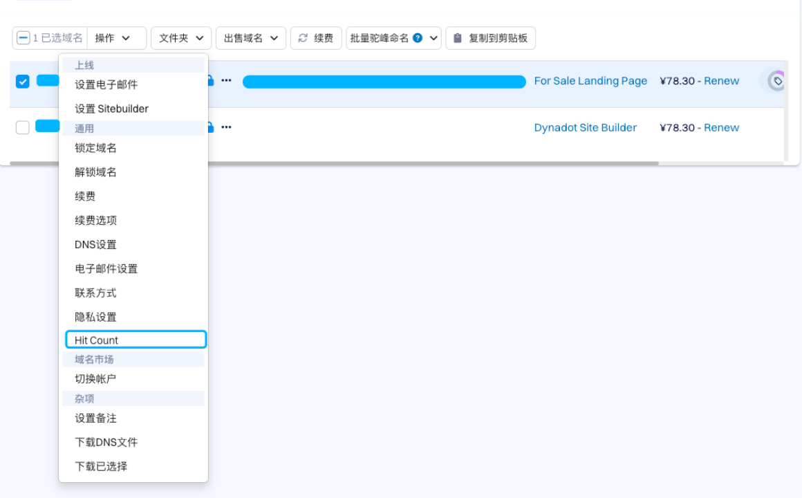 在列表中找到您想要查看的域名,勾选后,点击操作的下拉菜单,选择Hit Count。