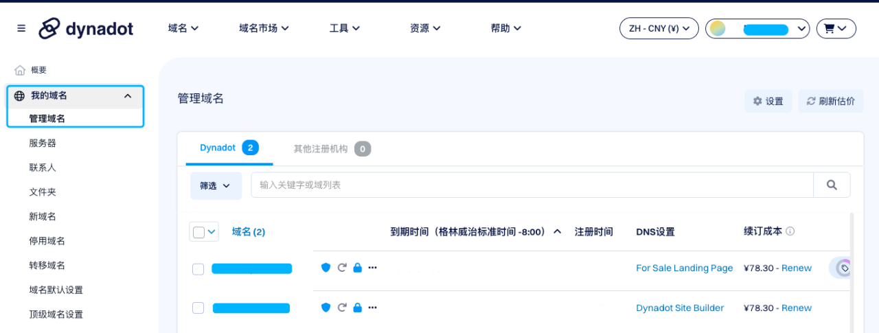 登录到的 Dynadot账户,在左侧的菜单栏选择我的域名下的管理域名选项。