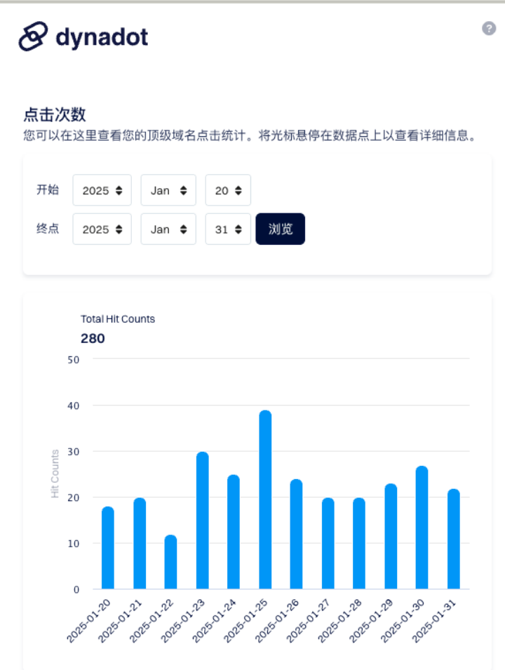 在Dynadot,如果用户使用了我们的域名转发(隐形转发),建站共计以及待售页面,都可以通过用户面板,使用流量统计工具查看某一域名在某一时间段内的流量情况。