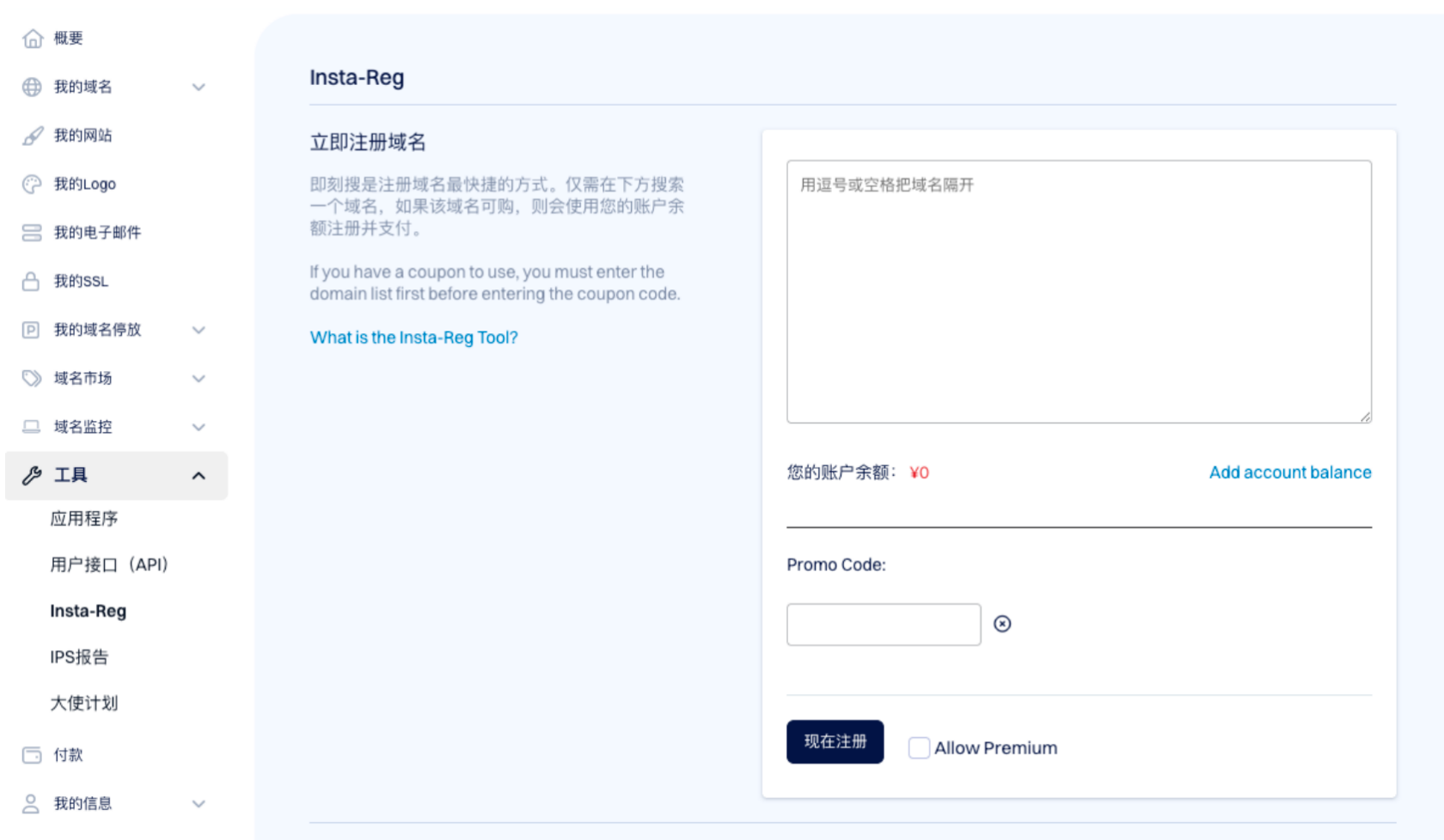 登录Dynadot账户界面后,从左侧菜单栏选择"工具",在下拉菜单中点击"Insta-Reg"。进入对应的批量注册界面。