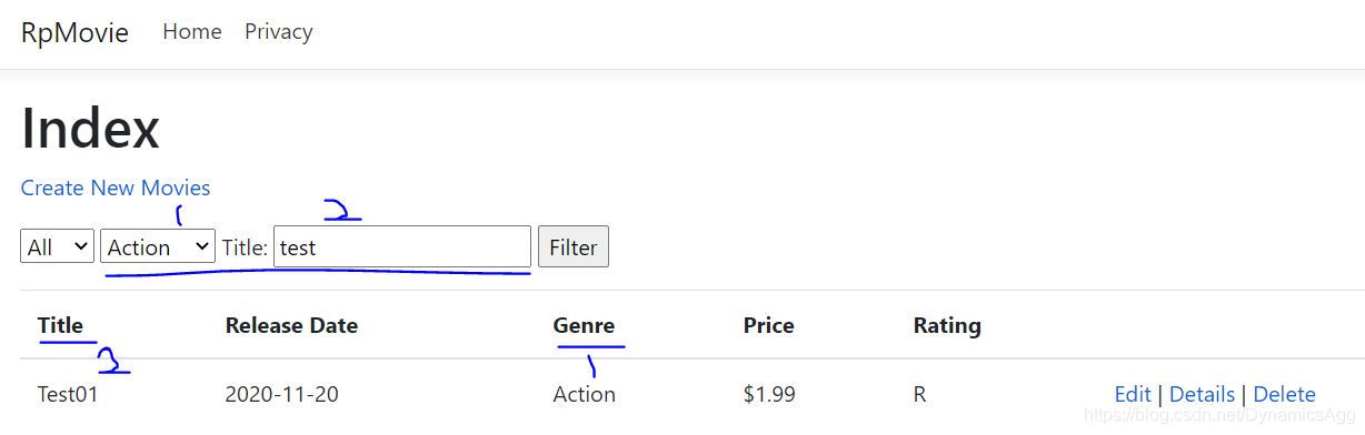3. F5或者点击IIS Express 运行solution, 你应该可以看到搜索的功能对于 Title / Genre 已经开起来了. 1对应Genre, 2对应Title, 点击Filter之后可以看到搜索效果已经出来了;