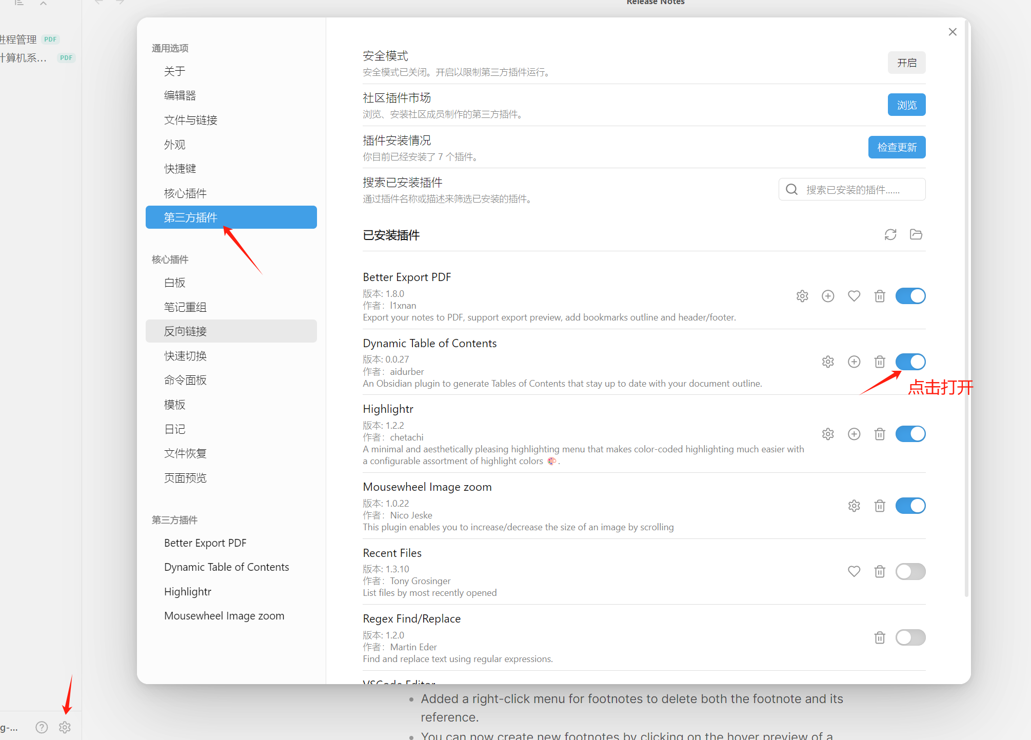 4. 使用obisidian打开刚刚配置的仓库,点击设置中的第三方插件,找到Dynamic Table of Contents,打开即可。如果没有显示出来,可以点击刷新再试试