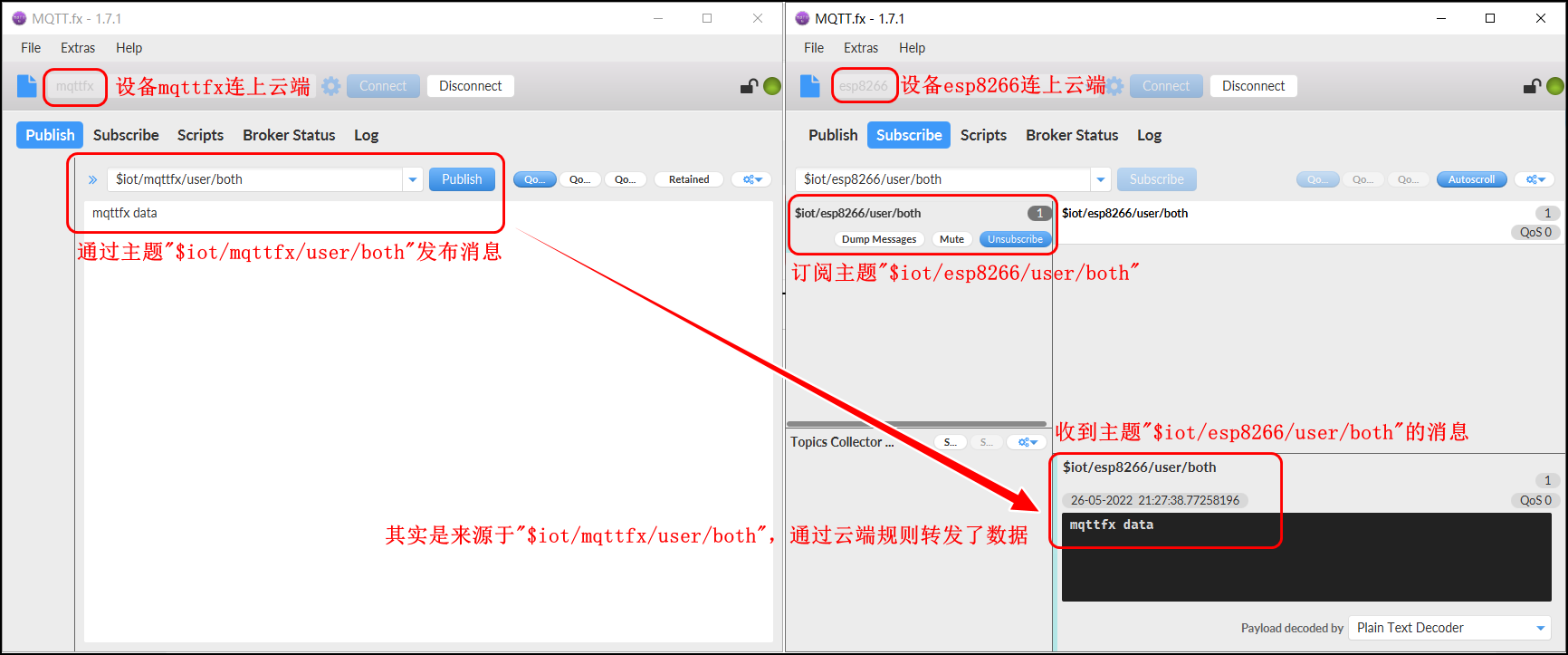就可以将mqttfx通过主题"$iot/mqttfx/user/both" 发布的数据转发给"$iot/esp8266/user/both";