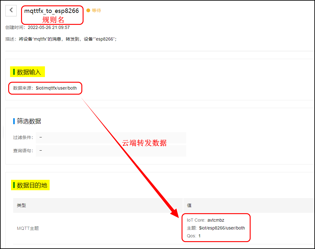 比如mqttfx_to_esp8266,数据来源选择"$iot/mqttfx/user/both",数据目的地选择"$iot/esp8266/user/both";