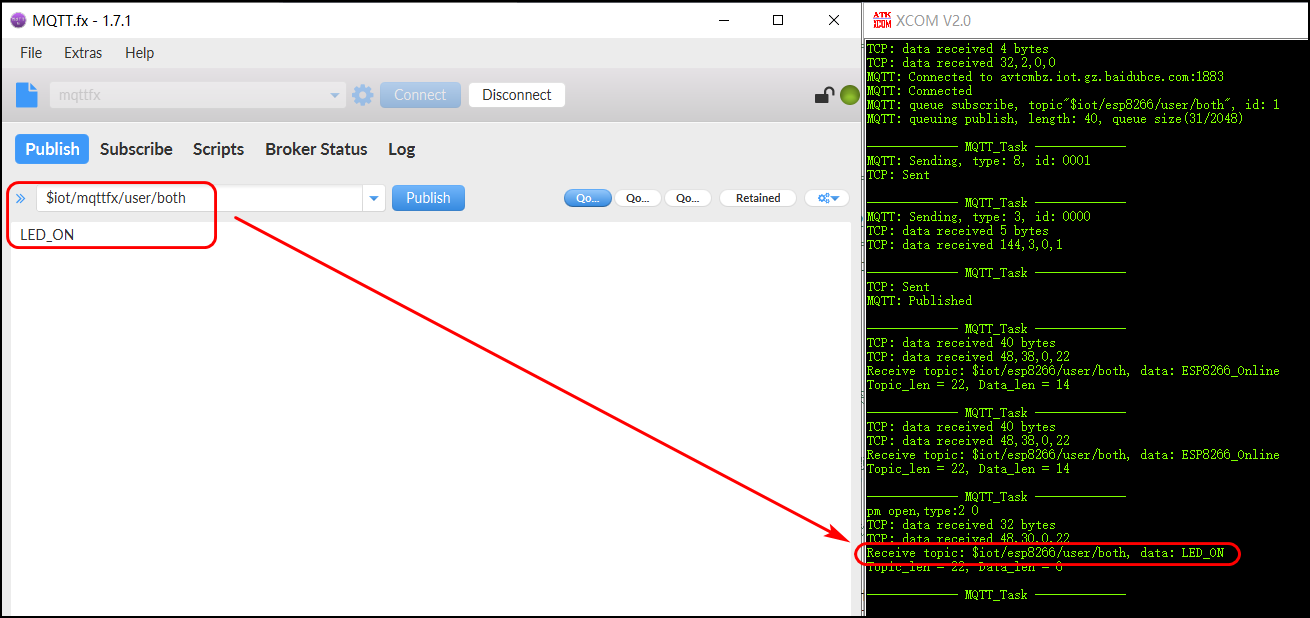 设备"mqttfx"在主题"$iot/mqttfx/user/both"下发送"LED_ON",设备"esp8266"收到主题"$iot/esp8266/user/both"的"LED_ON",且灯被点亮;