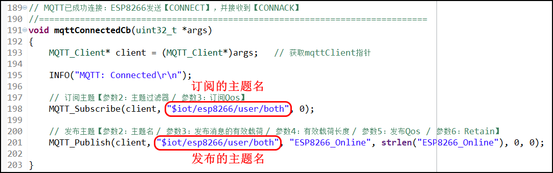 3.3、修改user_main.c中要发布和订阅的主题名为"$iot/esp8266/user/both"