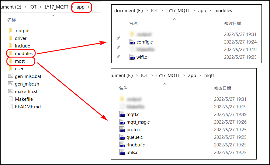 3.1.1、在app文件夹下,新增子文件夹modules和mqtt,并添加.c文件如下