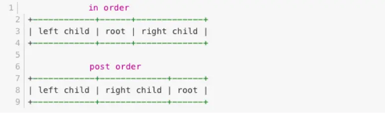 则我们可以分别找到两颗子树对应的中序和后序遍历: