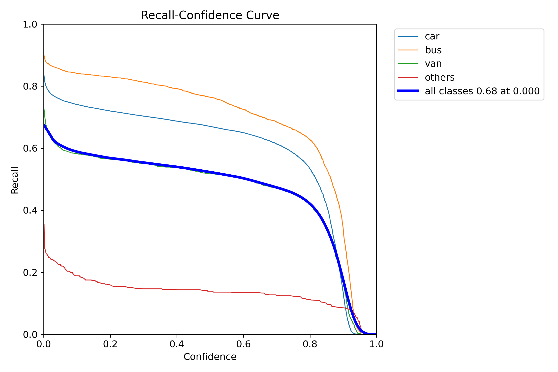 在我们的任务重,当置信度阈值为0的时候,我们模型的召回率可以达到68.8%。