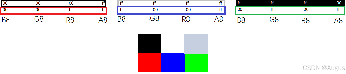 第一个像素黑色,红绿蓝都没有颜色所以为0,不透明所以最高字节为FF。