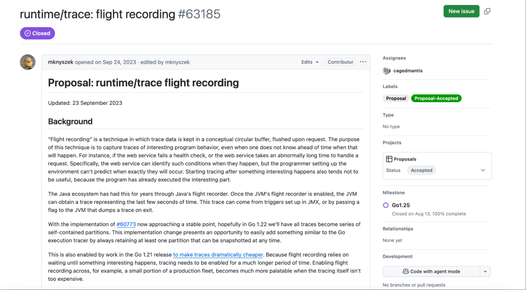 这个特性在 Go1.25 正式可用了,配合之前几个版本对 tracing 的优化(Go1.21 降低了开销,Go1.22 改进了 trace 格式),整个诊断工具链越来越成熟了。
