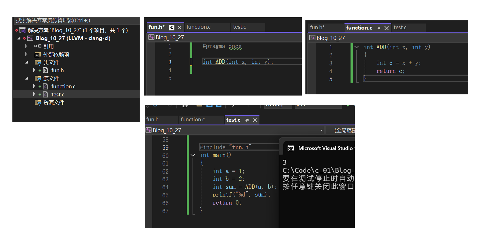 • 函数需要先声明再使用,如上图二。函数的定义是一种特殊的声明,如果前文已经有了定义,就不用再声明了,如上图一。函数的定义也可以在其他文件中,使用前先声明即可,库函数实际上就是这样操作的,库函数的声明在头文件中。我们也可以如此操作,下面有图像演示。需要注意的是,自己定义的头文件用 " "括起来,而不是 < >