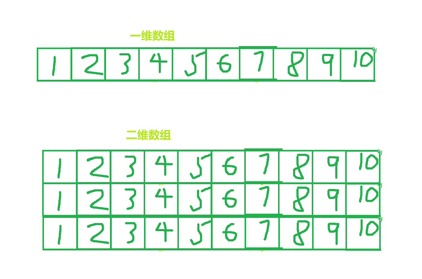 • 可以分为一维数组和多维数组(2维及以上),最常用的是一维数组和二维数组。