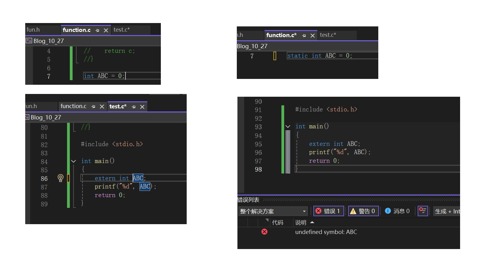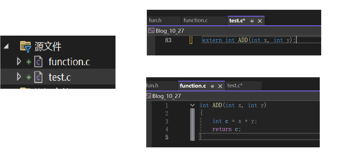 具有外部链接属性的变量,函数等,通过extern声明可以实现跨源文件使用。如图操作,即可在test.c中使用function.c中的自定义函数ADD()了