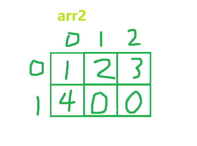 • 从第二种可以发现,同样可以只初始化部分元素,剩余位置会进行默认初始化。元素会先按顺序先填第一行的每一列,再填入下一行(下面有图片说明)