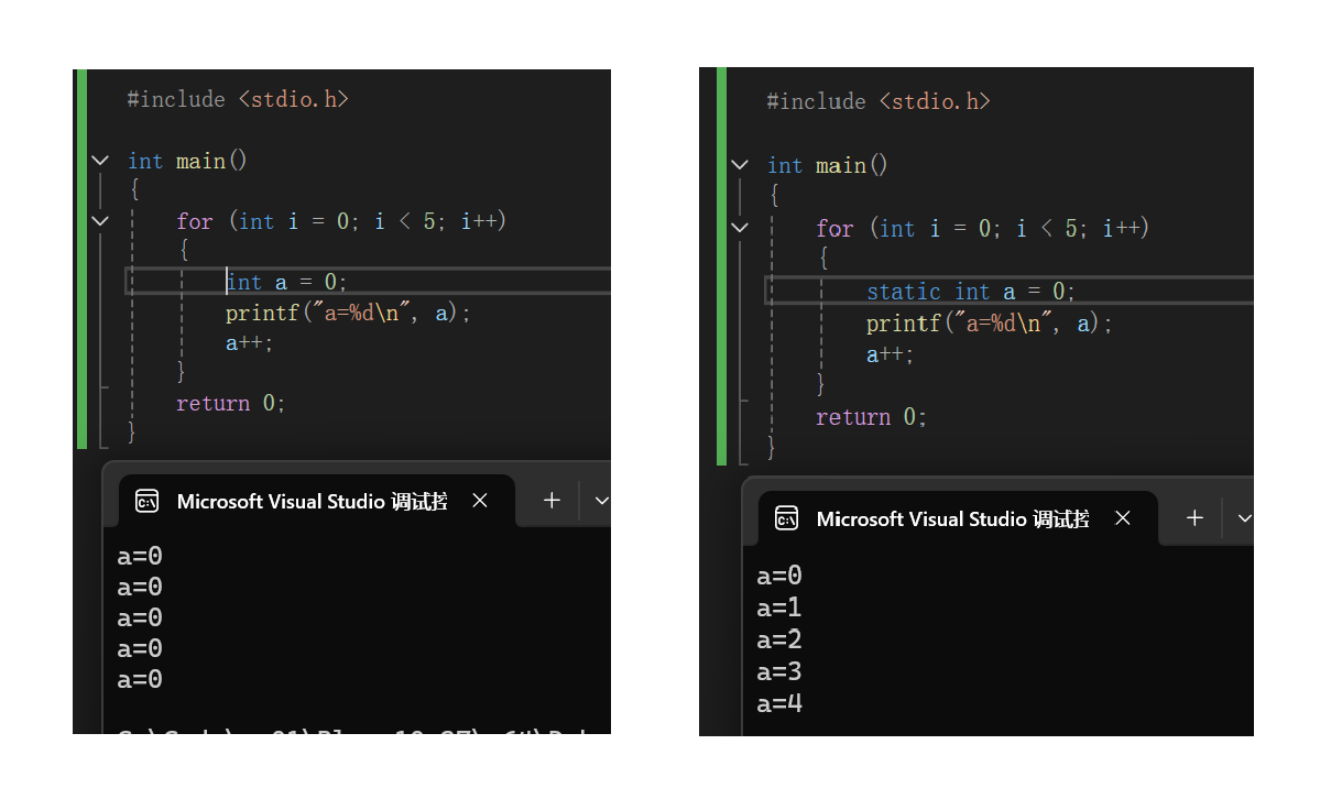 static表示静止的,当static修饰局部变量时,它的作用域不变,但生命周期会变长,不会随着出作用域而销毁,当程序结束时才会销毁。本质是:被static修饰的局部变量不再在栈区创建,而是在静态区创建。我们可以对比下面两段代码。