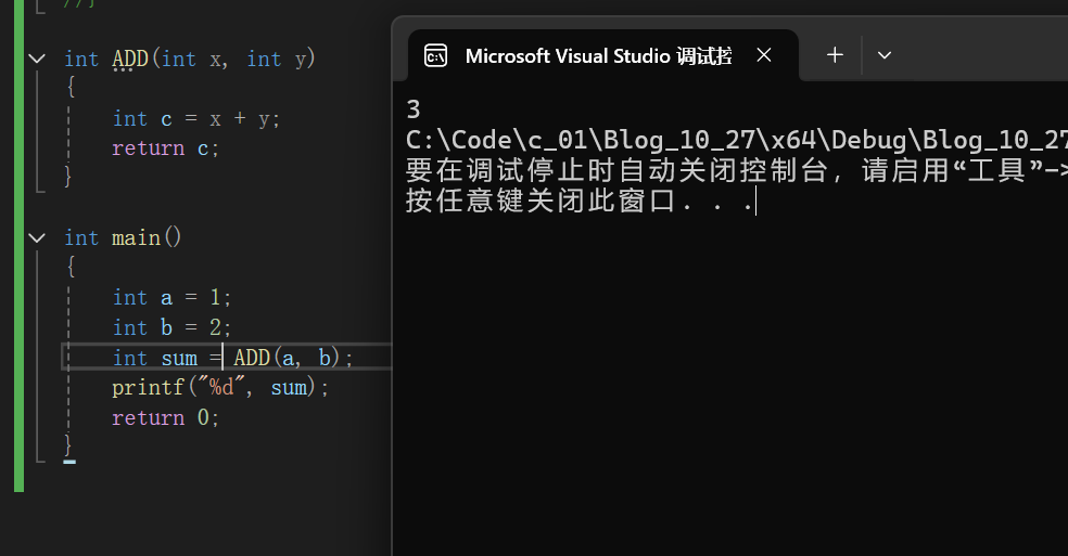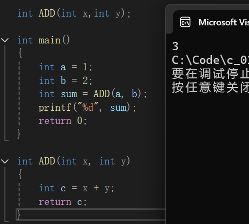 函数使用时的语法为Fuc(传入的实际参数); 如图中的ADD(a,b);