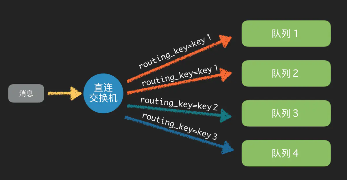 直连交换机是一种带路由功能的交换机,一个队列会和一个交换机绑定,除此之外再绑定一个routing_key,当消息被发送的时候,需要指定一个binding_key,这个消息被送达交换机的时候,就会被这个交换机送到指定的队列里面去。同样的一个binding_key也是支持应用到多个队列中的