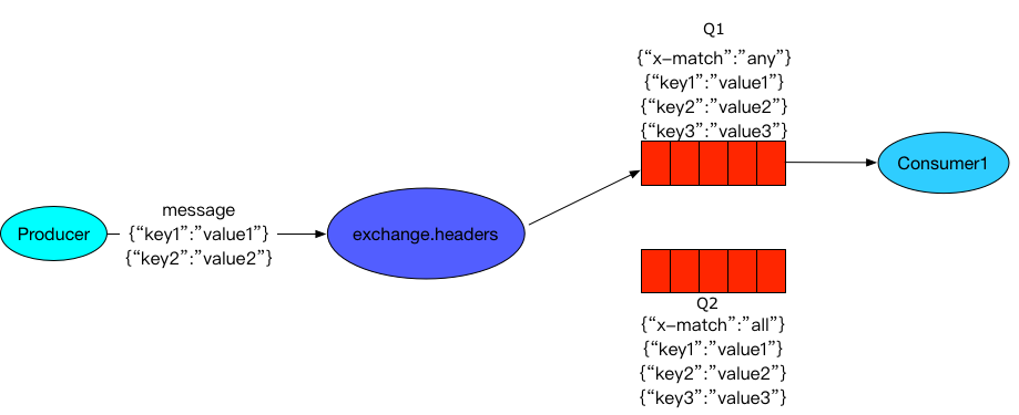 将一个交换机声明成首部交换机,绑定一个队列的时候,定义一个Hash的数据结构,消息发送的时候,会携带一组hash数据结构的信息,当Hash的内容匹配上的时候,消息就会被写入队列。