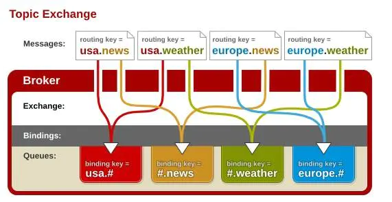 所以RabbitMQ提供了一种主题交换机,发送到主题交换机上的消息需要携带指定规则的routing_key,主题交换机会根据这个规则将数据发送到对应的(多个)队列上。