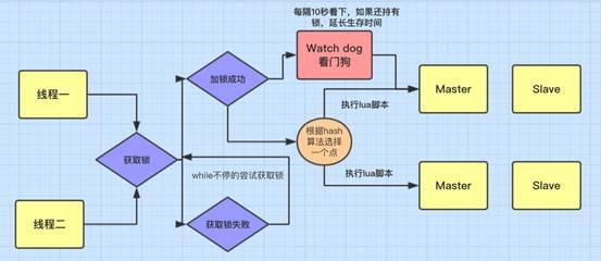 线程去获取锁,获取失败: 一直通过while循环尝试获取锁,获取成功后,执行lua脚本,保存数据到redis数据库。