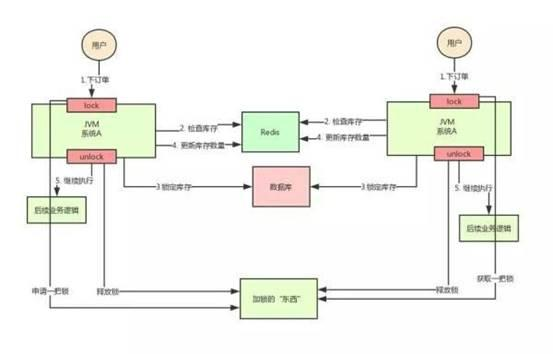 因为上图中的两个 A 系统,运行在两个不同的 JVM 里面,他们加的锁只对属于自己 JVM 里面的线程有效,对于其他 JVM 的线程是无效的。