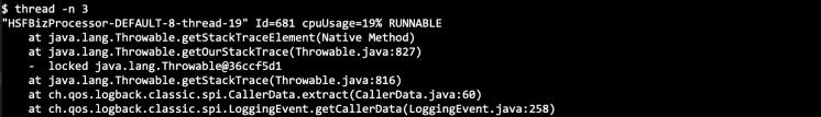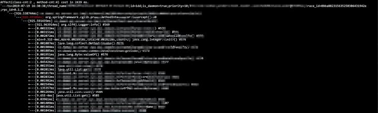 thread -n 3 -i 10000 可以统计 10 秒内最忙的 3 个线程,并且打印它们的堆栈,很容易发现问题。最终发现的问题比较简单:日志中打印了 location 的信息,包括 类名、方法名和行号。