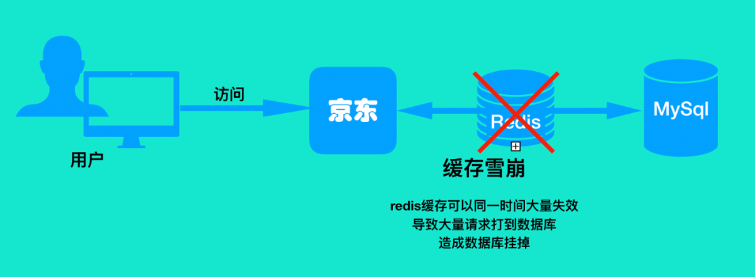 假设首页数据存储在 redis 里的 100 个 key,设置的缓存失效时间是两个小时,当在双十一期间,购物超过两个小时之后,这个首页数据的 redis 缓存在这瞬间会全部失效,导致所有的请求都打到这个 MySql 数据库上,此时数据库的访问压力增大,造成这个 MySql 数据库响应不及时而挂掉,从而某东的首页就没办法继续对外提供服务了,然后东哥就特别不开心,把这次的技术负责人送去了非洲。