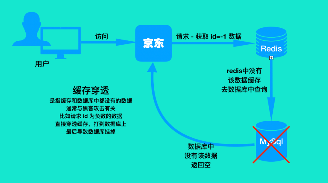 首先这个恶意用户访问某东,用 id=-1 的数据去请求,然后这个 id=-1 的数据在 redis 缓存里面没有查到,就到数据库里面查询,也没有查到该条数据,只能返回空数据给前端了。