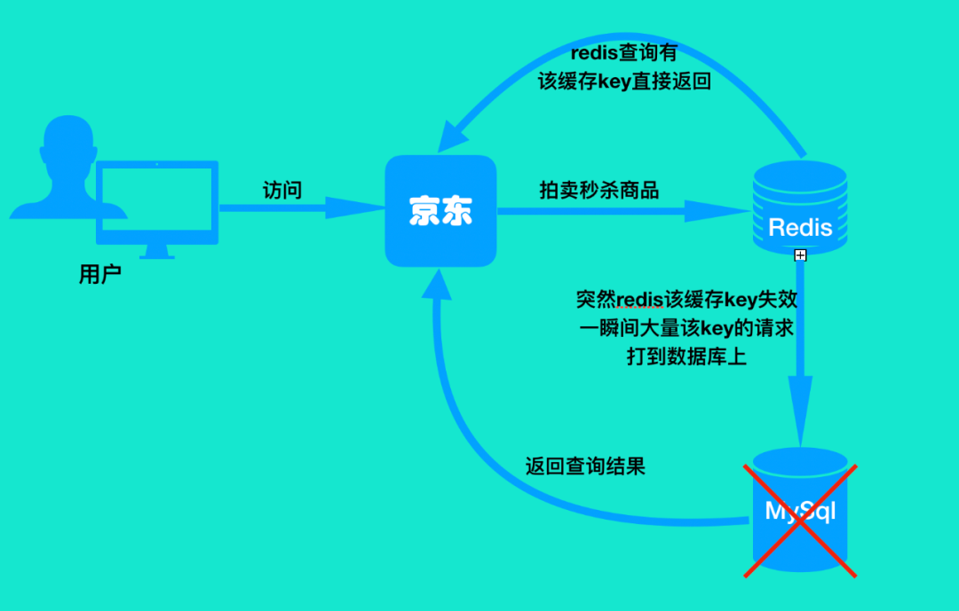 用户访问某东,然后去 redis 请求某个拍卖秒杀商品,在缓存没有失效的时候,redis 可以把这个查询到的缓存 key 的结果返回回去,但是当这个缓存的 key 失效了,这个请求就会击穿这个 redis,直接打到数据库上。