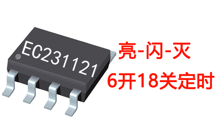 EC231121-21AB-9E38两模式灯串芯片是一款专为LED圣诞灯串和节日电子礼品设计的低功耗控制芯片,采用SOP-8封装,具有常亮、闪烁和关闭三种工作模式,支持24小时循环定时功能,适用于电池供电的装饰照明场景。以下从功能特性、电气参数、应用设计及市场定位等方面展开详细分析。