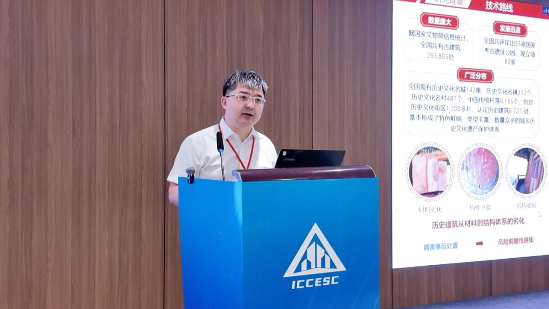 上海交通大学杨健教授以《多源数据驱动的文物建筑性能评估》为主题进行了精彩的报告。杨健教授长期致力于历史建筑保护与防灾技术研究,报告中他对遗产建筑的维护管理需要对其在当前使用状况下的健康性能进行可靠评估,并对未来的趋势做出合理预测。