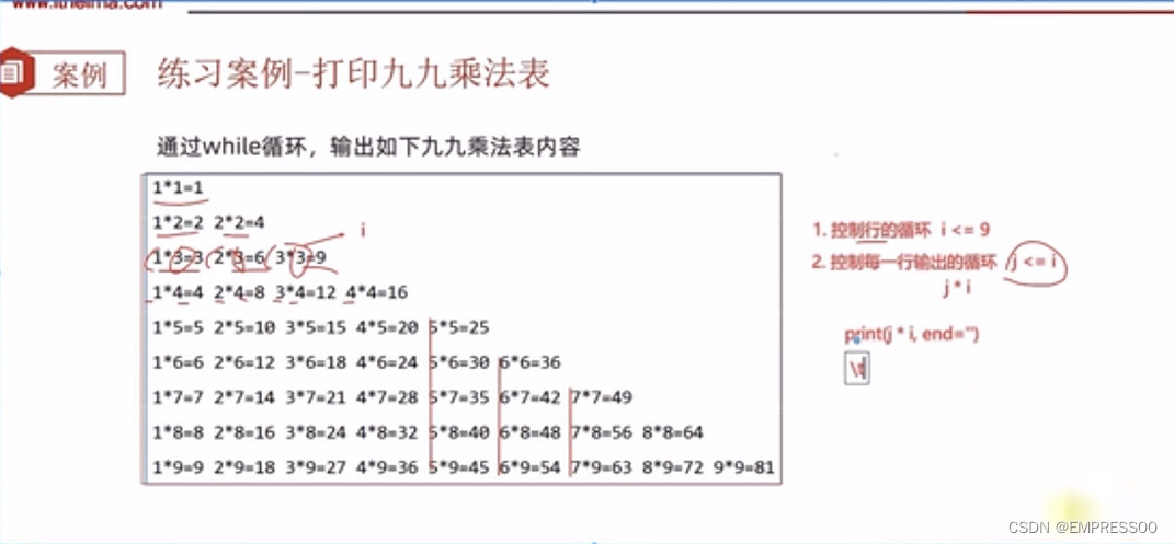 该代码使用Python编写了一个简单的乘法表,通过两层while循环,逐行打印1到9的乘积,每个数间用制表符分隔,行末则使用换行符。