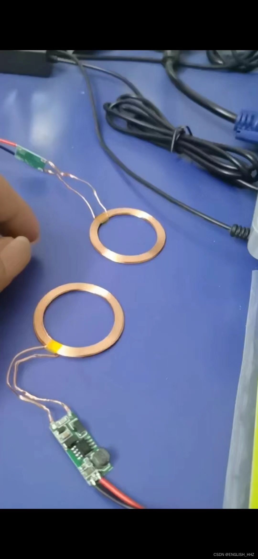 无线充电器模块分两部分,一部分12V供电输出感应,另一部分接收感应输出5V给锂电池充电。