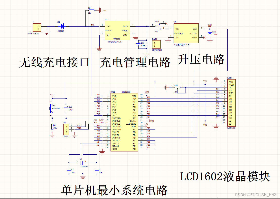 硬件构成:本系统由STC89C52单片机、LCD1602液晶显示、锂电池充电检测、无线充电模块、锂电池充电保护TP4056、升压稳压组成。