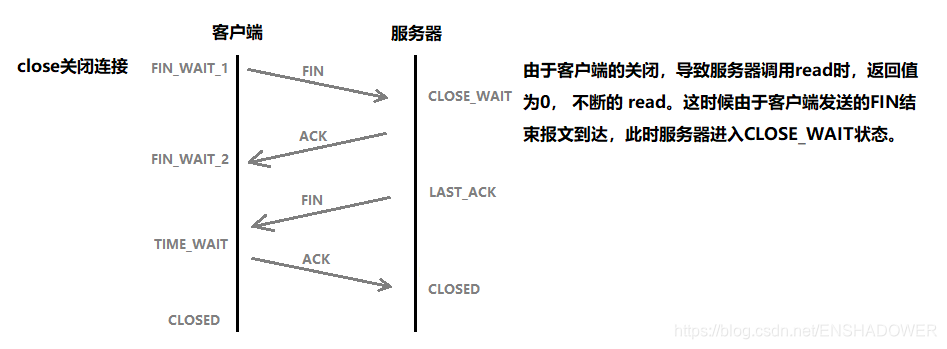 - 在客户端与服务器数据传输完毕之后,客户端没有请求了,所以此时调用close关闭文件描述符,开始进入FIN_WAIT_1状态,同时向服务器发送FIN结束报文段并等待服务器的响应。当服务器这里收到了FIN结束报文段时,这个时候服务器进入CLOSE_WAIT状态。并给客户端进行应答发送ACK。当客户端收到服务器的ACK响应时,进入FIN_WAIT_2状态。当服务器调用close时,会向客户端发送FIN结束报文段。此时进入LAST_ACK状态。此时的客户端收到服务器发送的FIN时,会向服务器进行响应ACK,并且客户端进入TIME_WAIT状态,TIME_WAIT结束之后,进入CLOSED,断开连接成功。当服务器收到客户端最后的ACK时,进入CLOSED状态,断开连接成功。