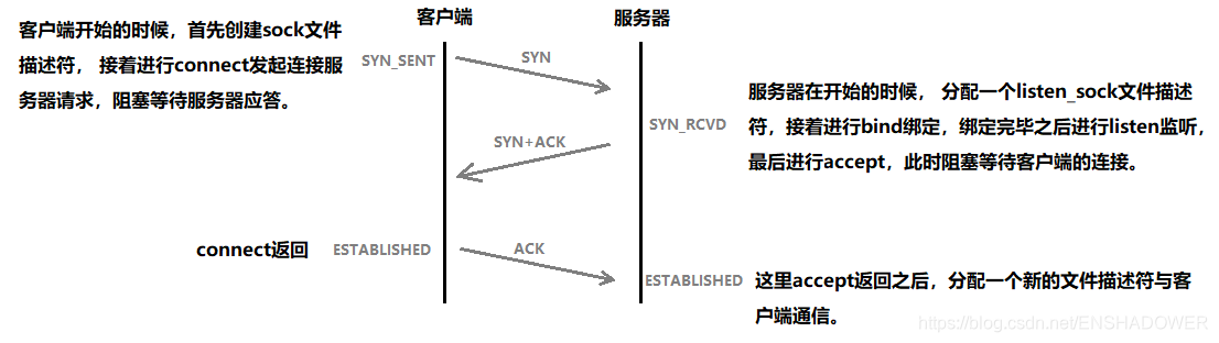 - 客户端与服务器在握手之前都做了一些前期的准备。服务器在开始先分配一个描述符,然后填充一下sockaddr_in结构体,绑定创建的文件描述符及服务器端口,接着listen监听,使得刚才的文件描述符成为一个监听描述符,最后阻塞至accept等待客户端的连接。而客户端相较来说简单一些,就是分配文件描述符,填充sockaddr_in结构体,最后进行connect请求服务器的连接,直至服务器响应。