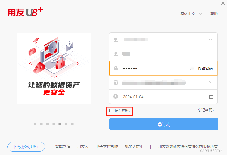 如何让U8系统记住自己的登录密码。登录时,勾选“记住密码” 再登录,以后每次登录不用再录密码。