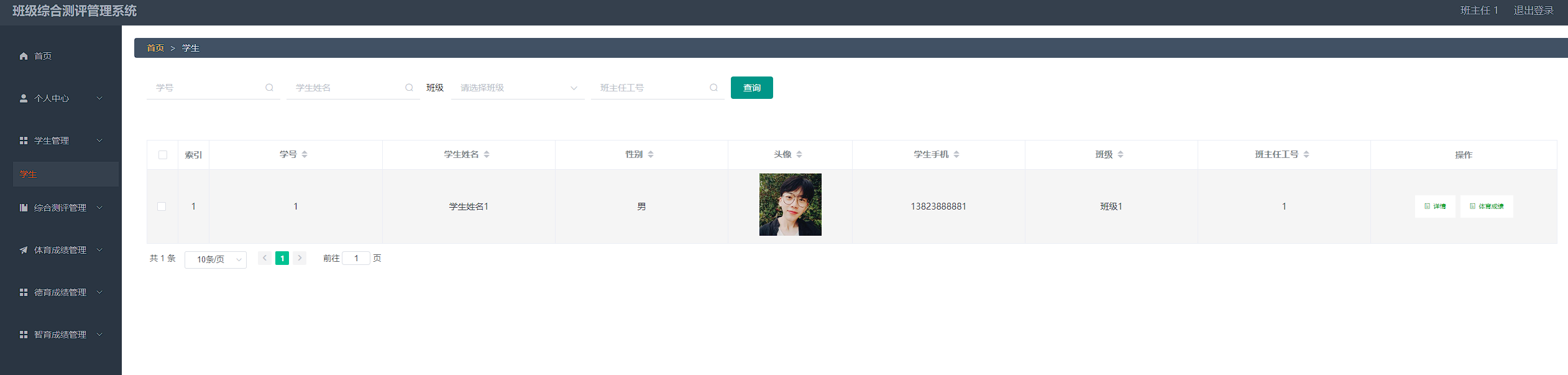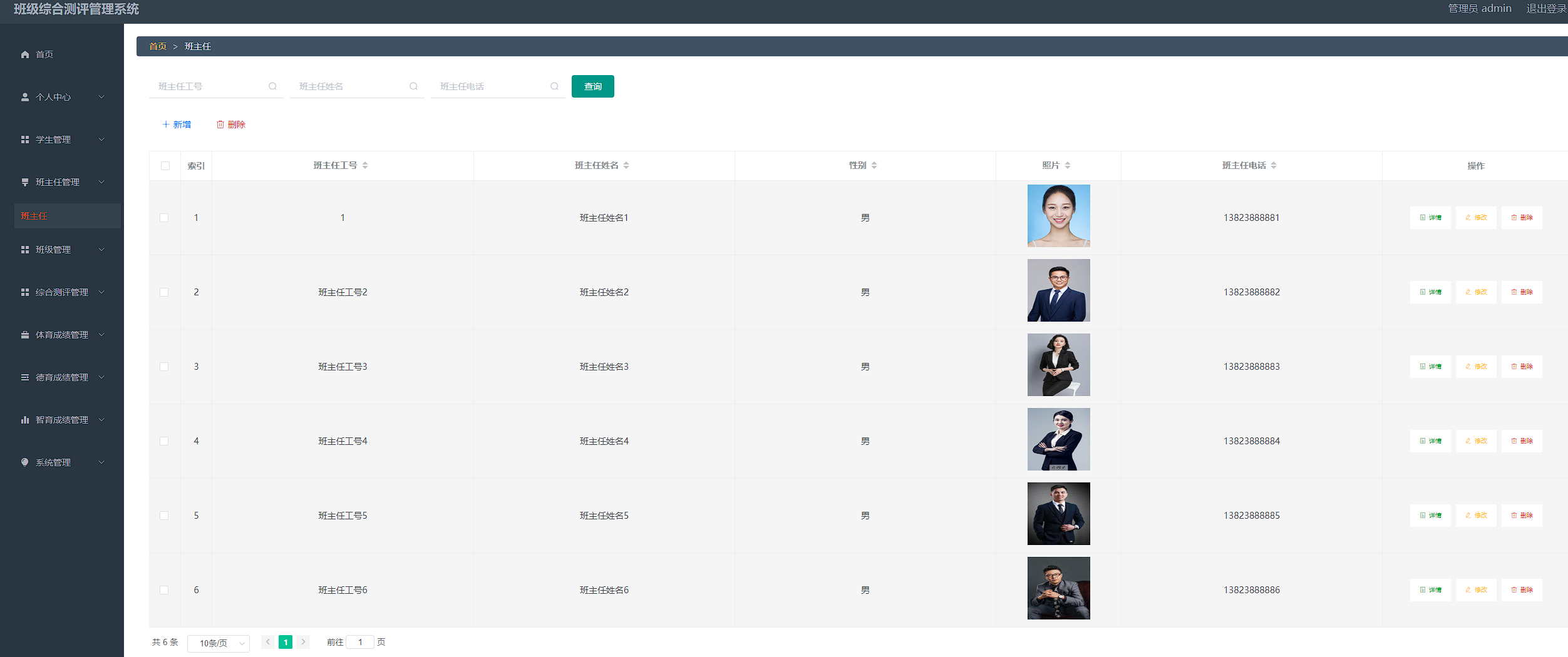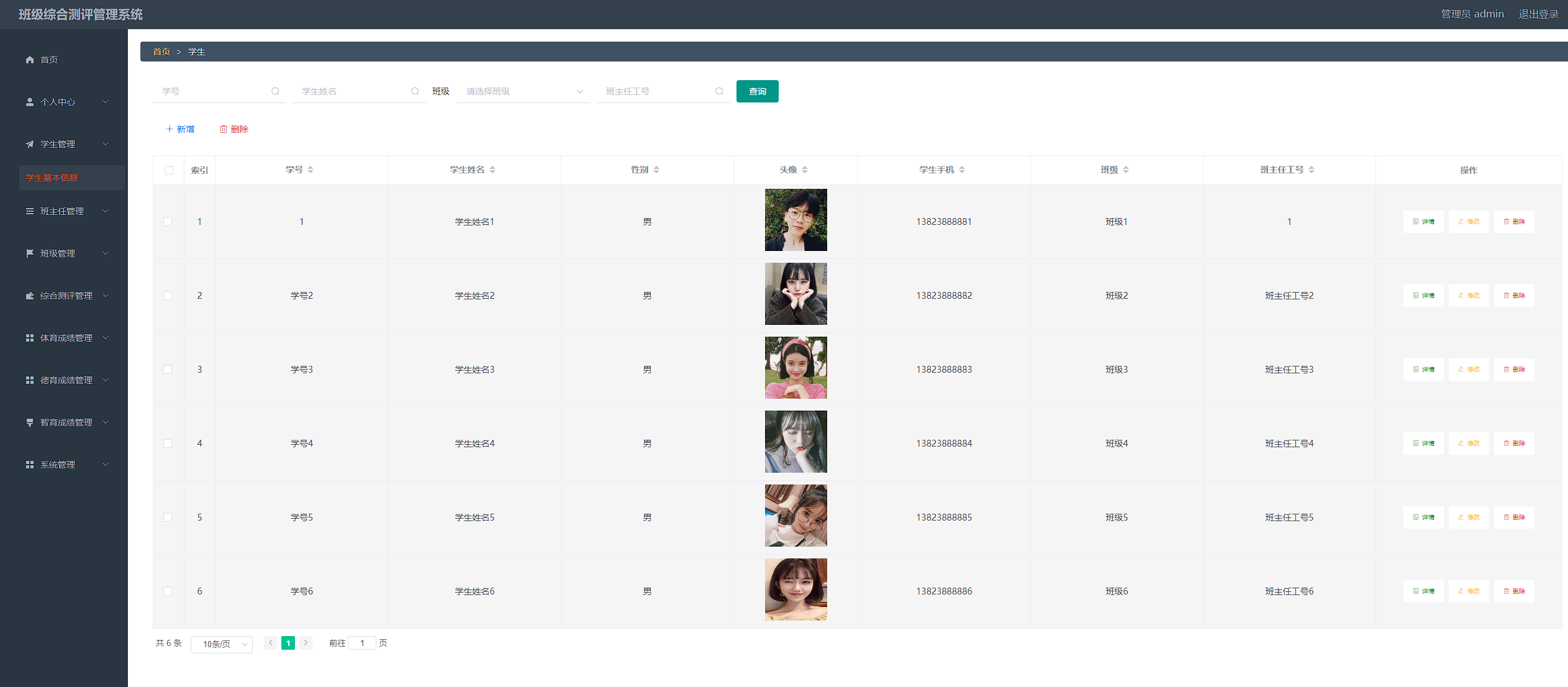 学生管理:在学生管理页面,可以对索引、学号、学生姓名、性别、班级、学生手机、班级、教师工号等内容进行详情、修改和删除等操作,