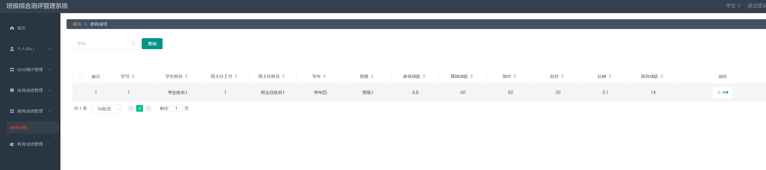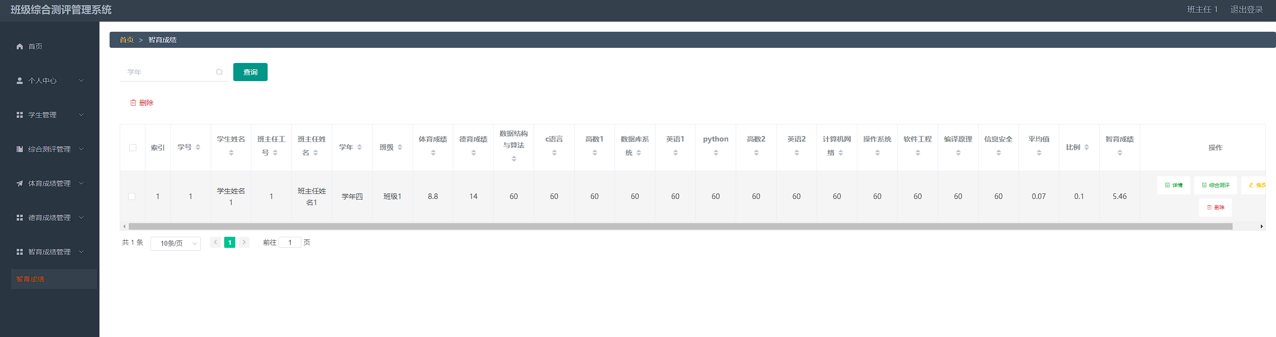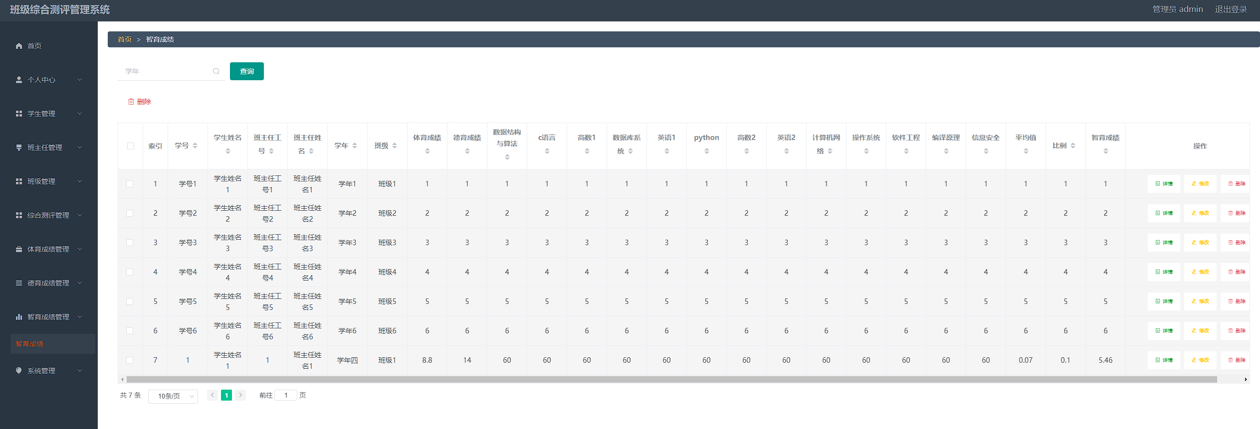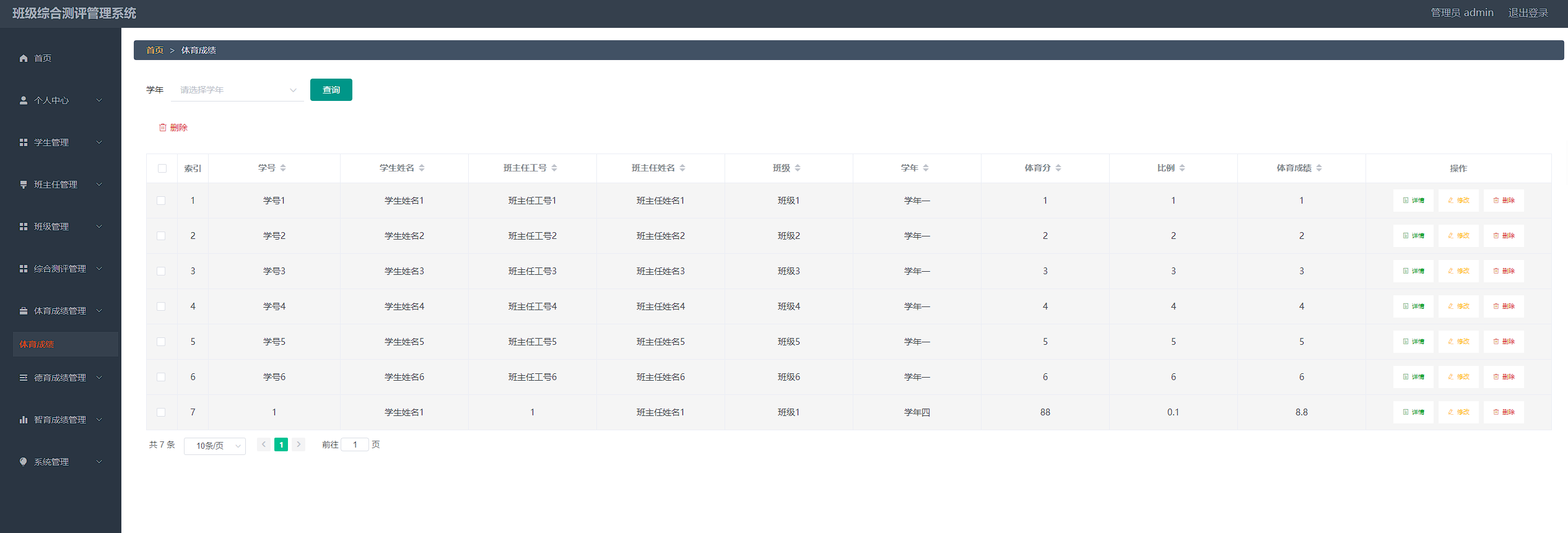 综合测评管理:在综合测评管理页面,可以对索引、学号、学生姓名、教师工号、教师姓名、班级、德育、智育、体育、综合成绩、录入时间等内容进行详情,修改和删除等操作