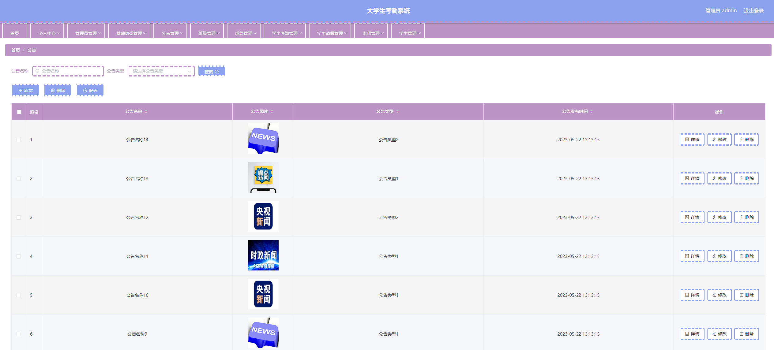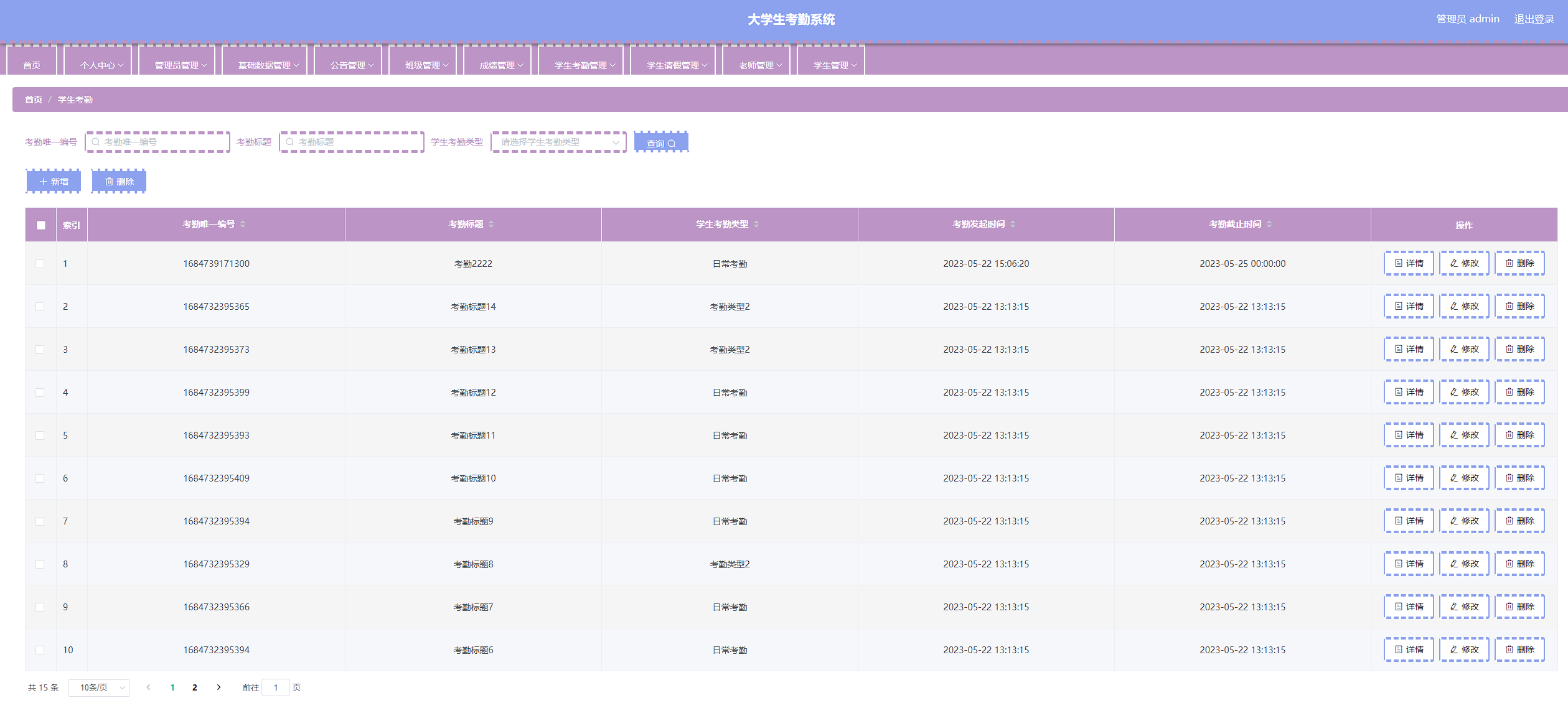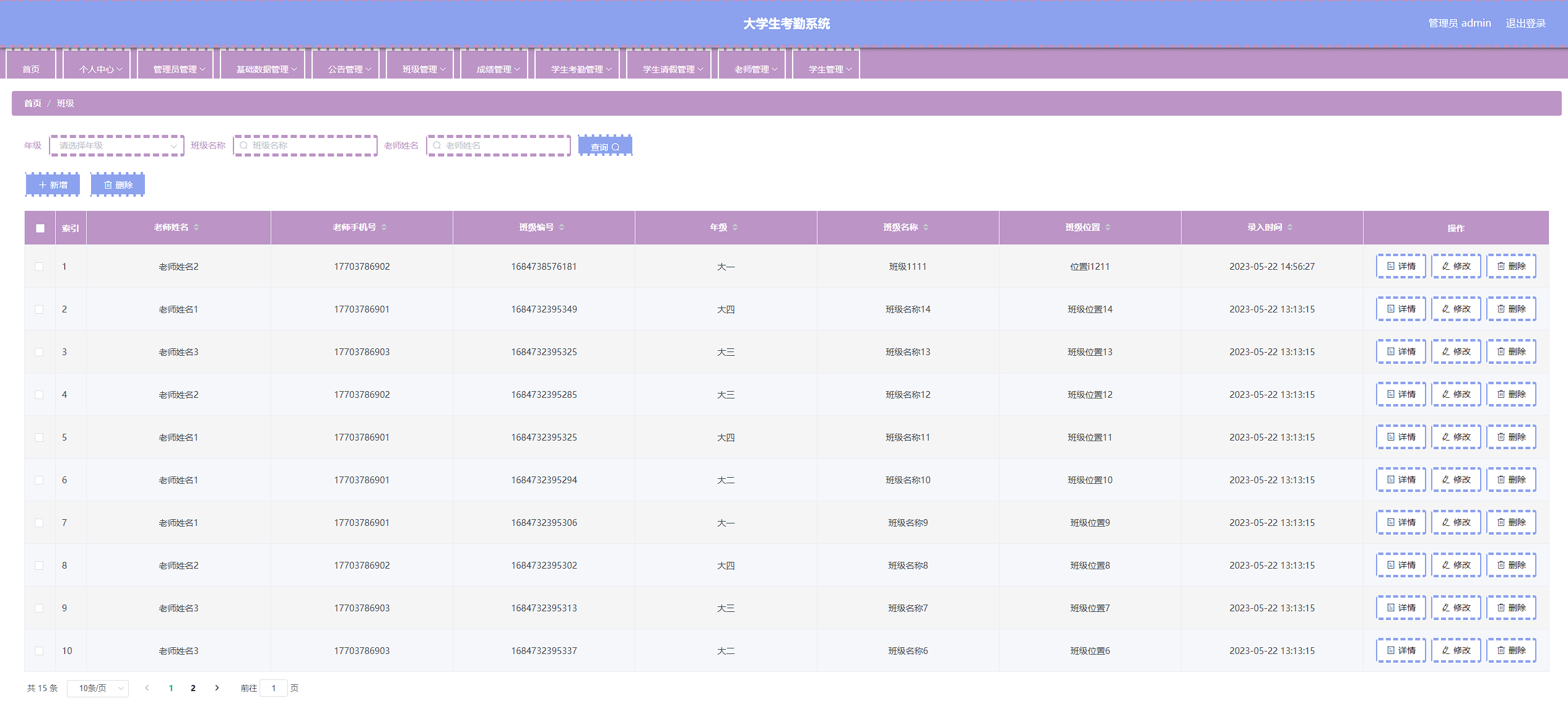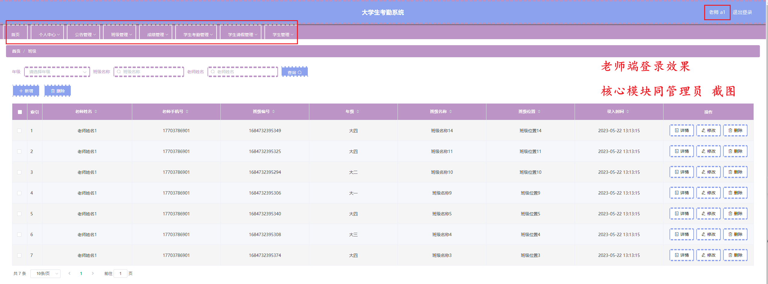 本次开发的大学生考勤系统实现了班级管理、成绩管理、字典管理、公告管理、老师管理、学生管理、学生考勤管理、学生考勤详情管理、学生请假管理、管理员管理等功能。