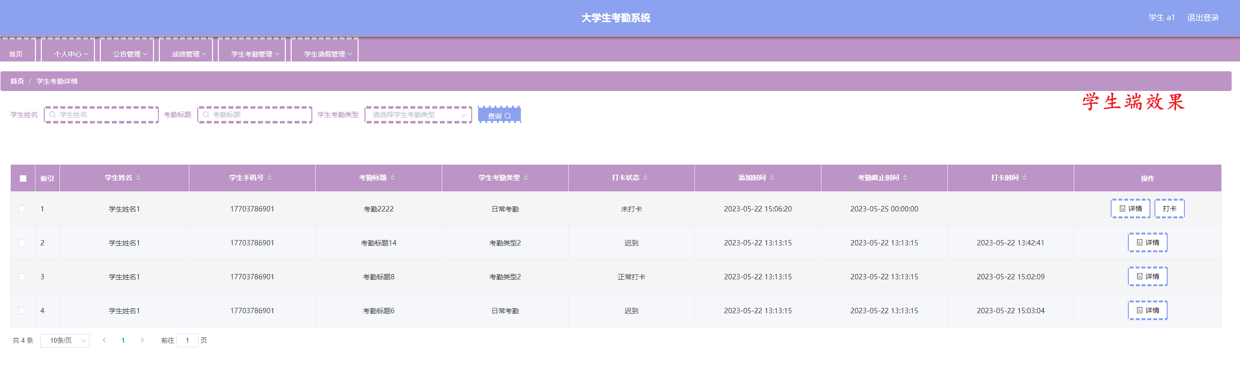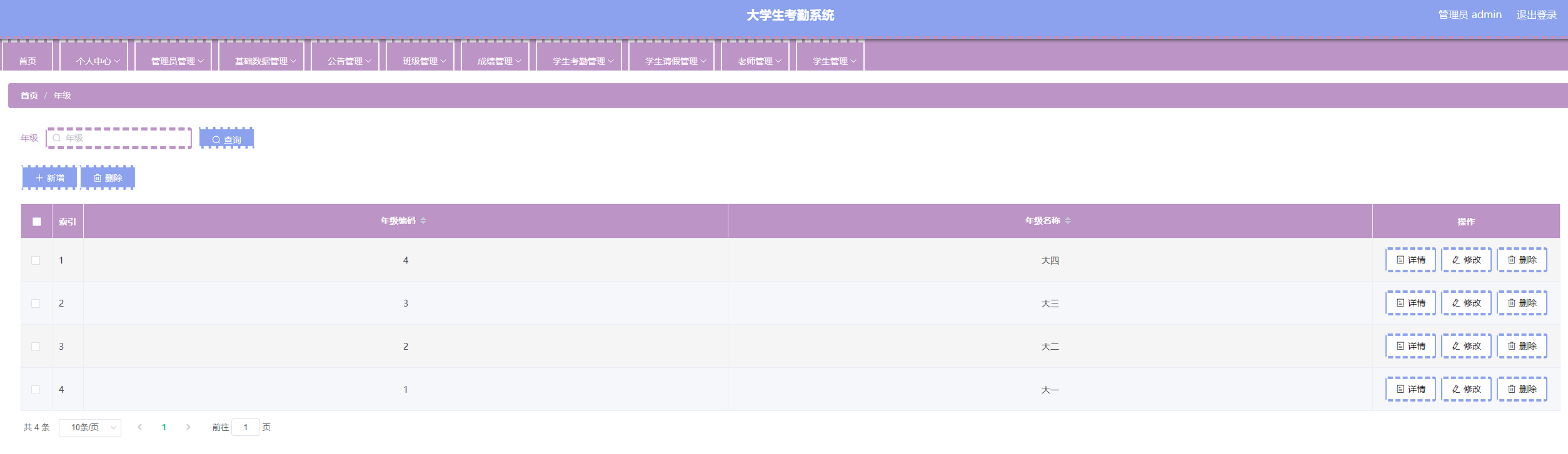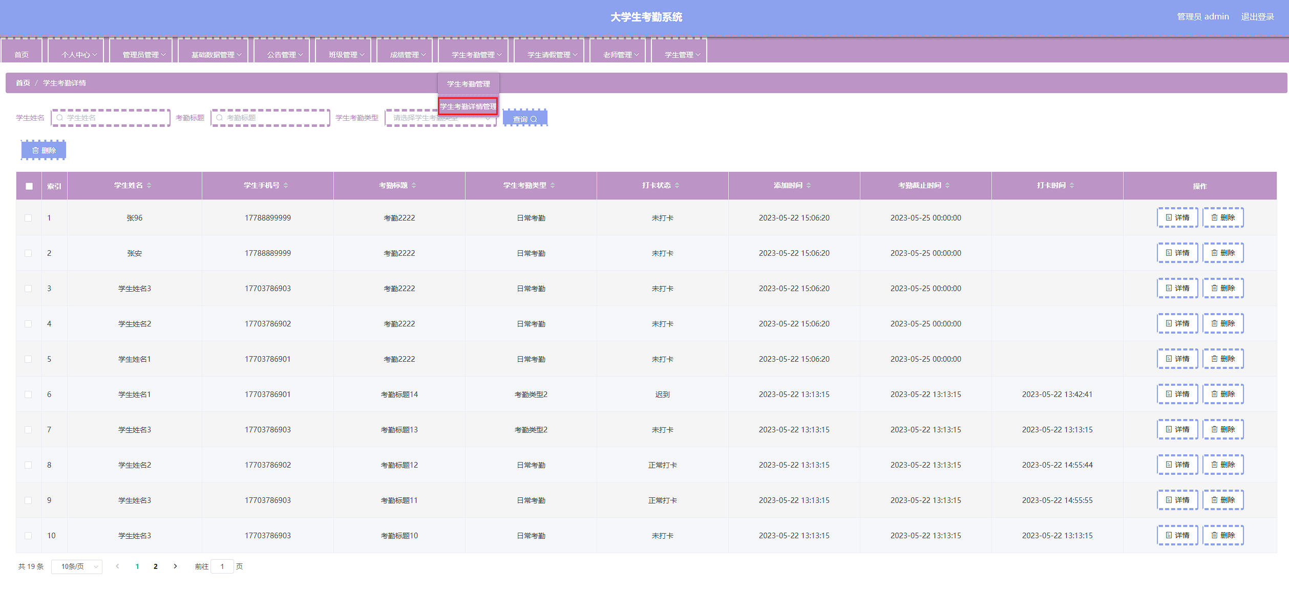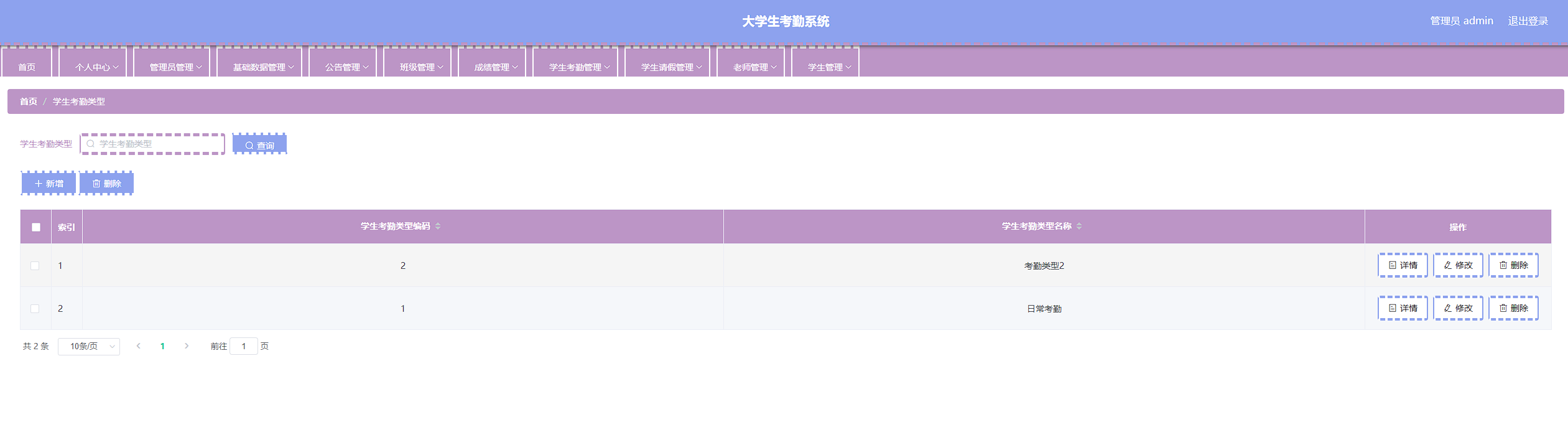 本次开发的大学生考勤系统实现了班级管理、成绩管理、字典管理、公告管理、老师管理、学生管理、学生考勤管理、学生考勤详情管理、学生请假管理、管理员管理等功能。
