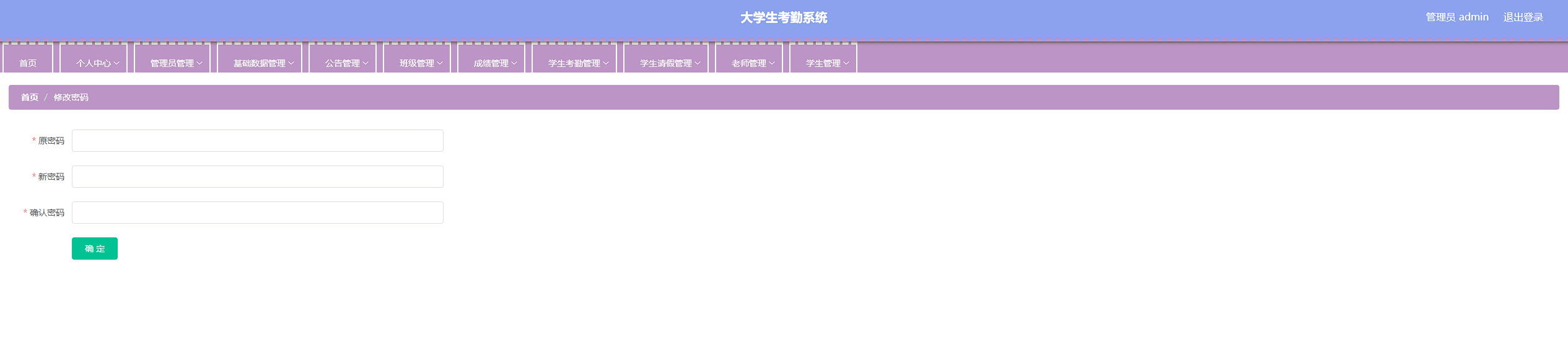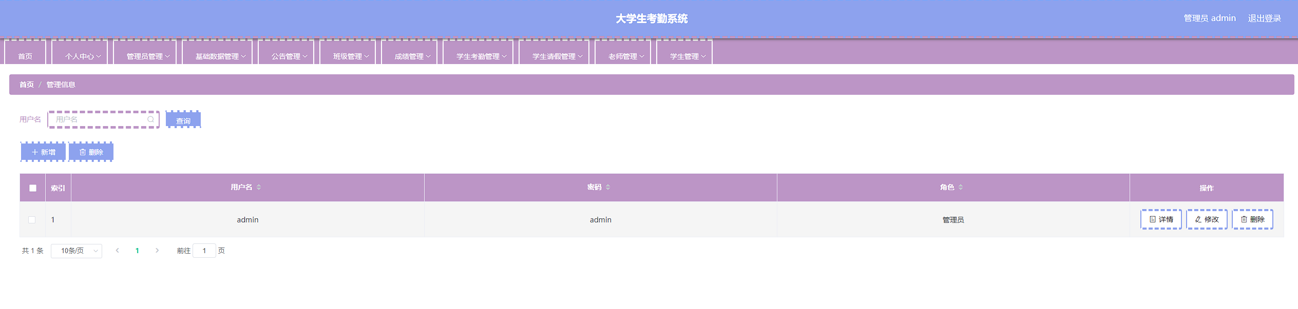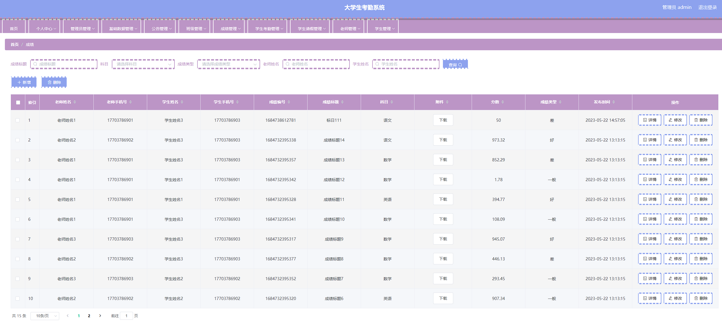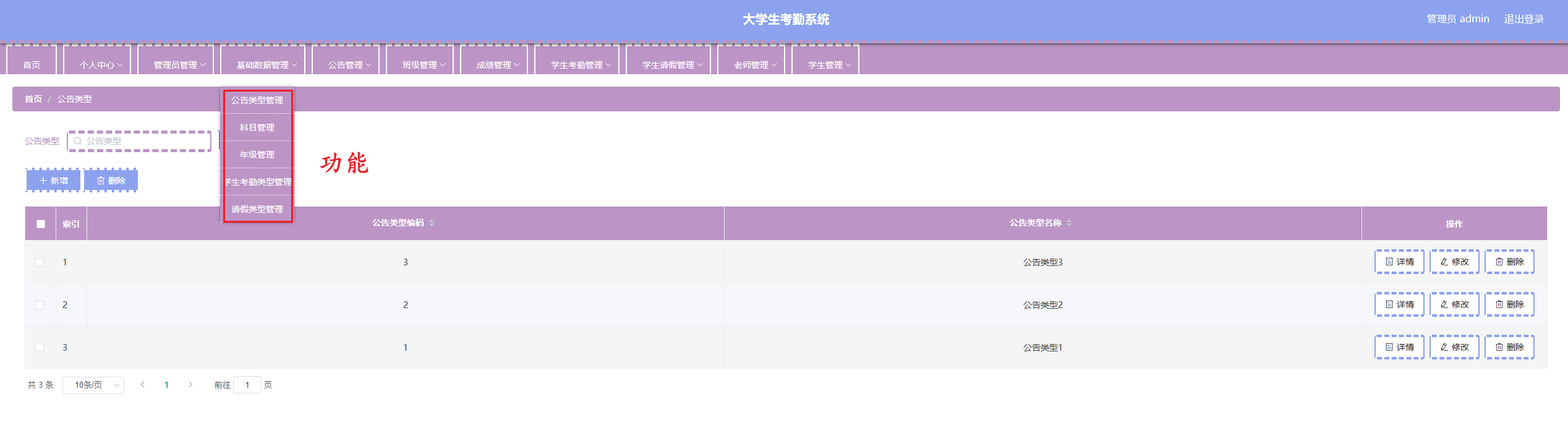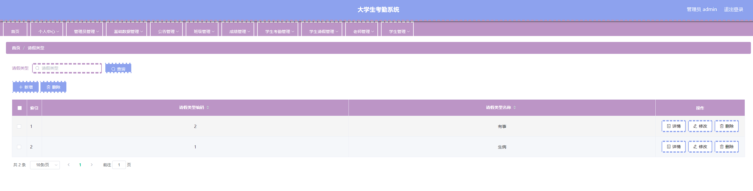 本次开发的大学生考勤系统实现了班级管理、成绩管理、字典管理、公告管理、老师管理、学生管理、学生考勤管理、学生考勤详情管理、学生请假管理、管理员管理等功能。