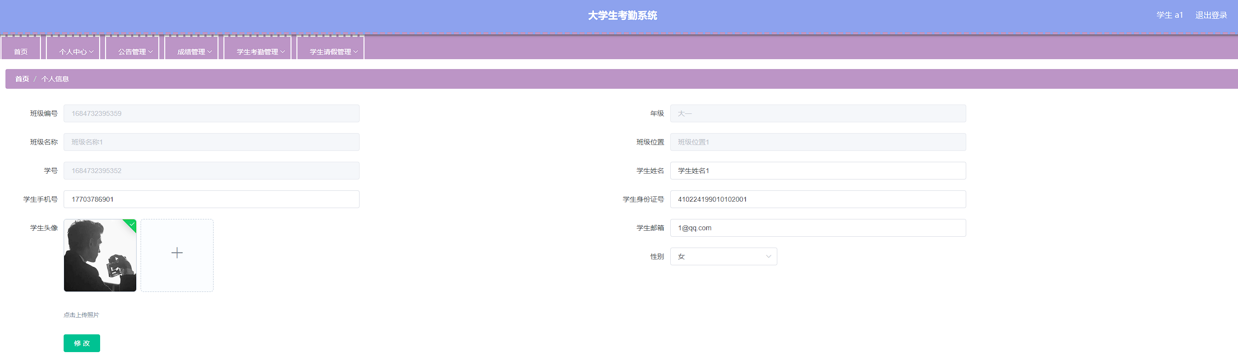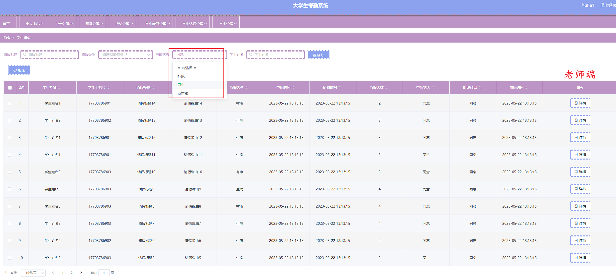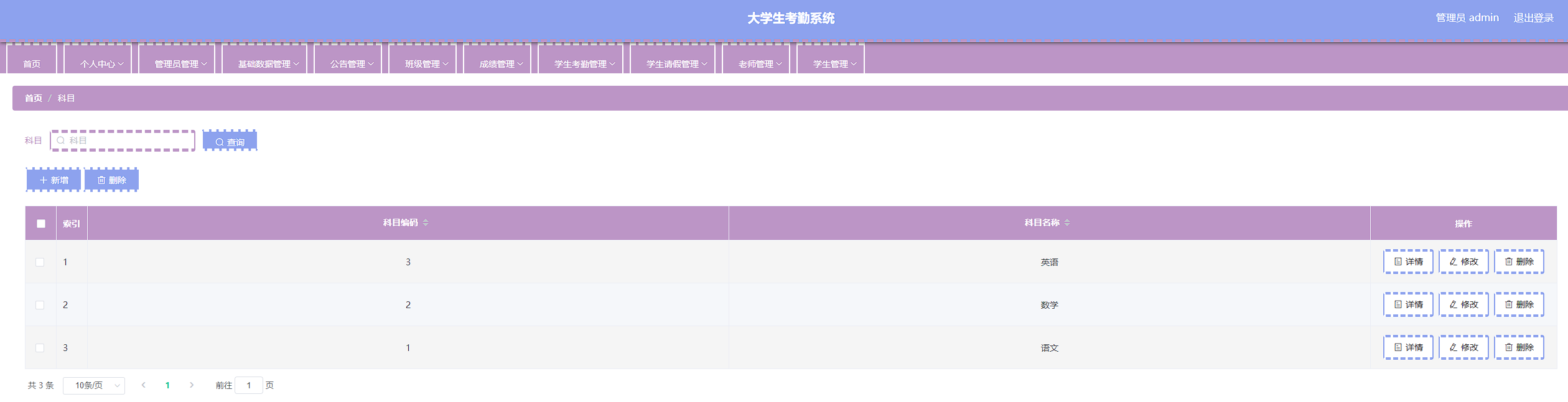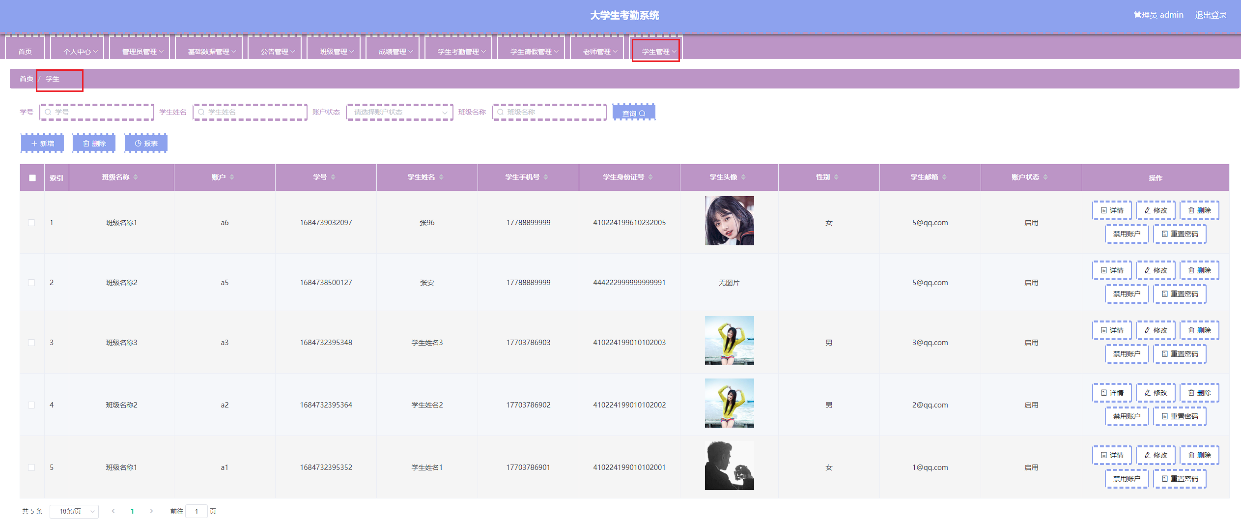 本次开发的大学生考勤系统实现了班级管理、成绩管理、字典管理、公告管理、老师管理、学生管理、学生考勤管理、学生考勤详情管理、学生请假管理、管理员管理等功能。