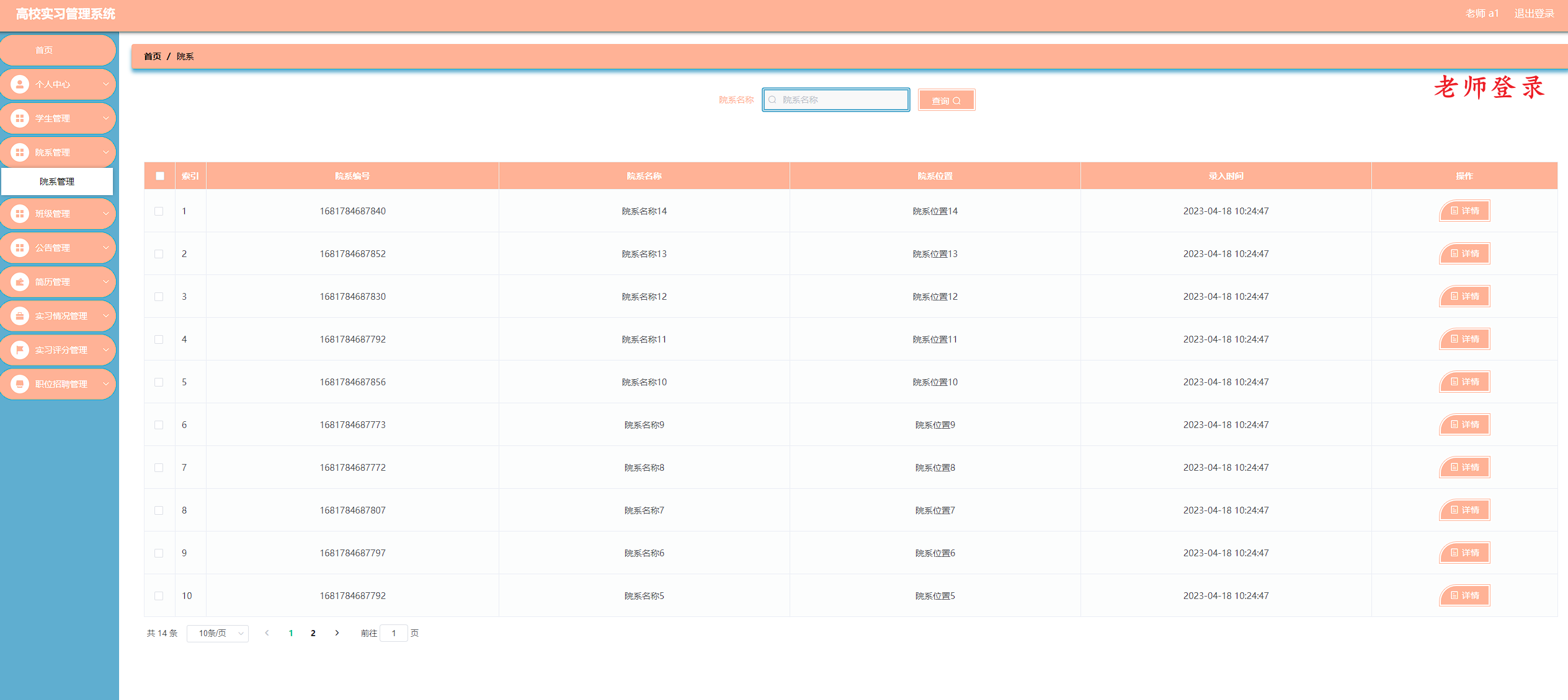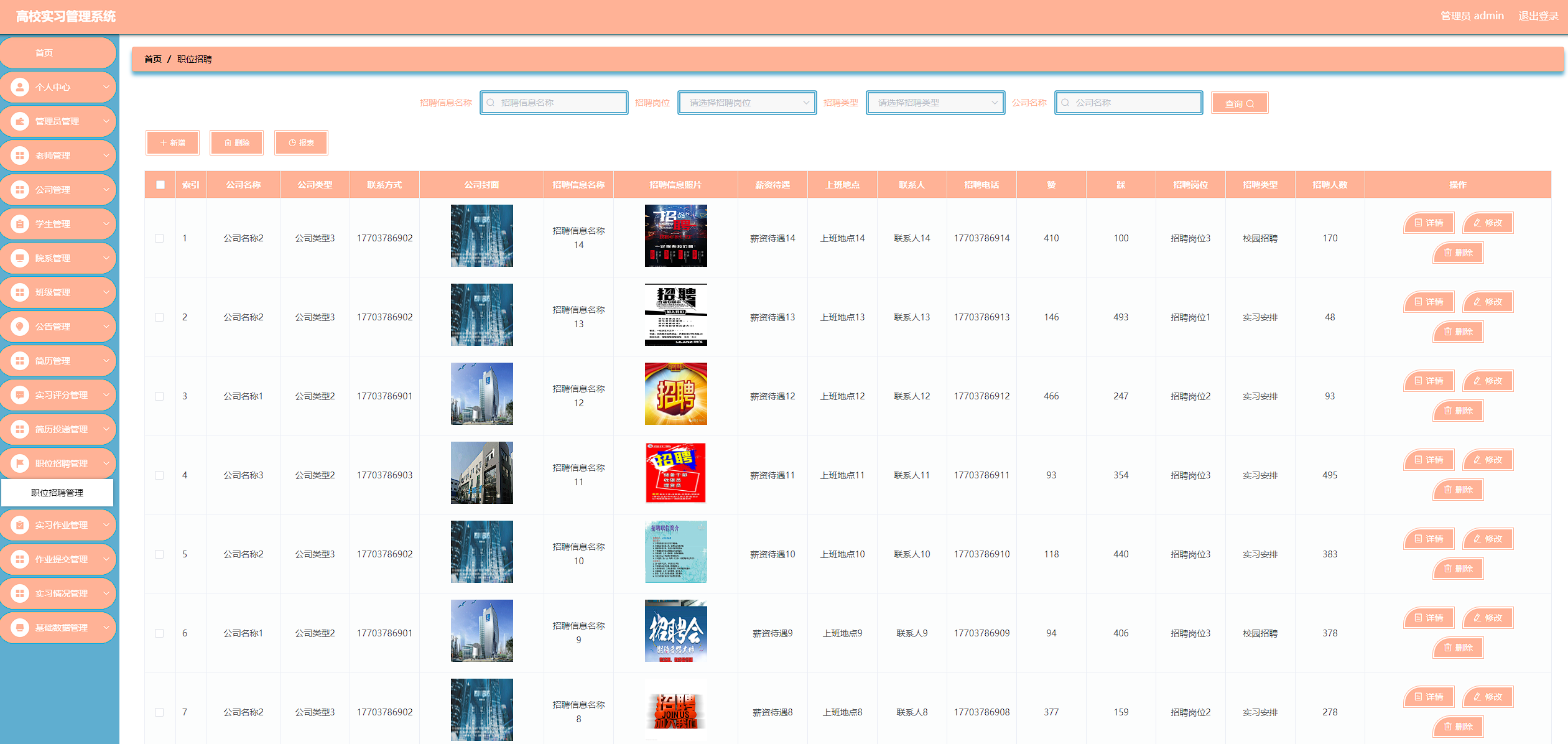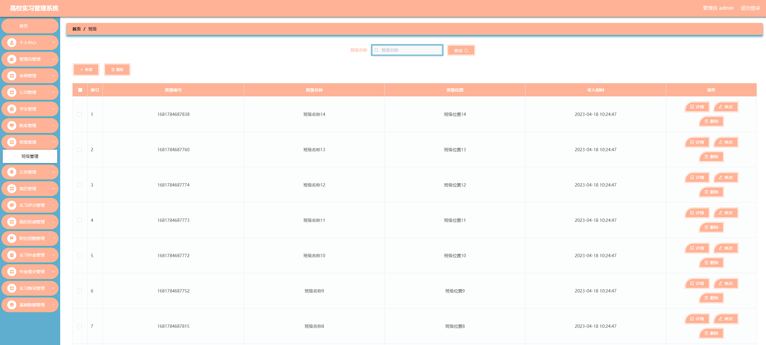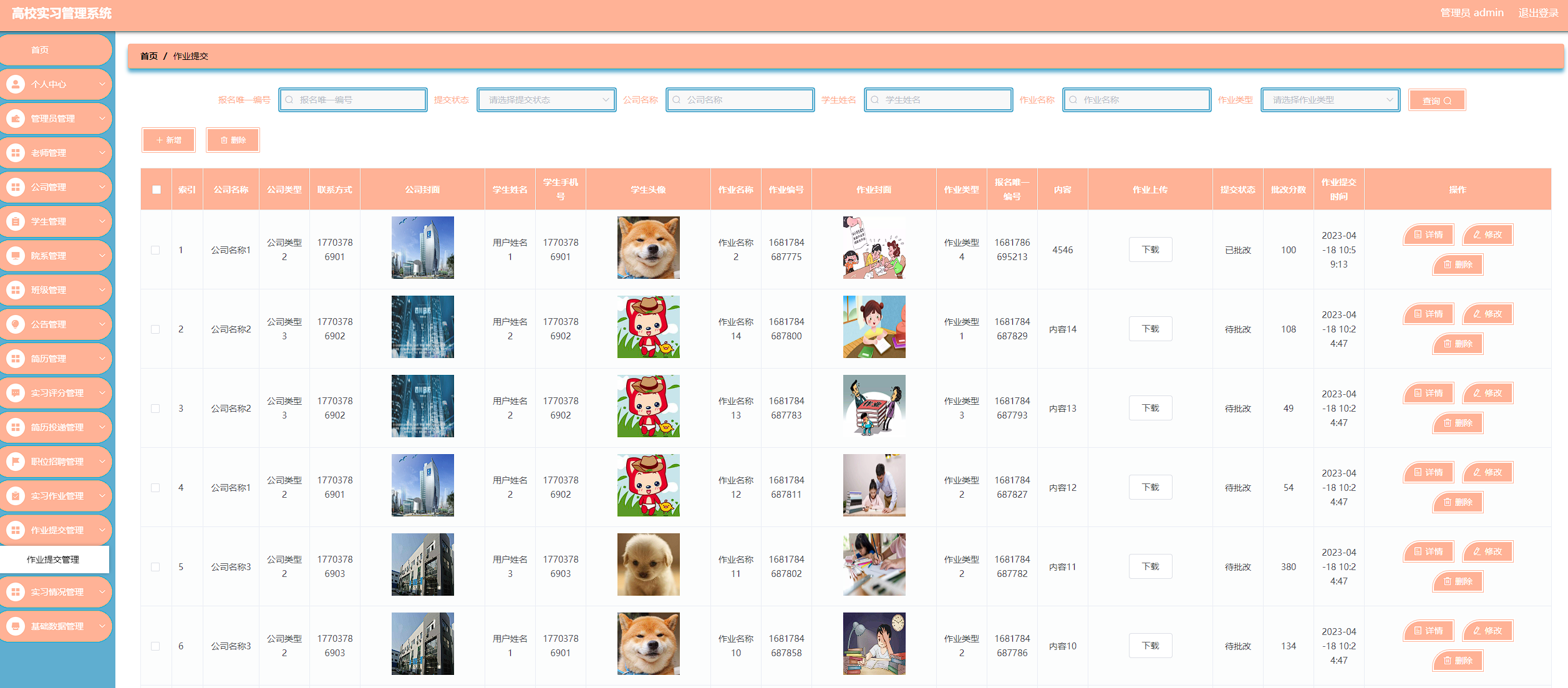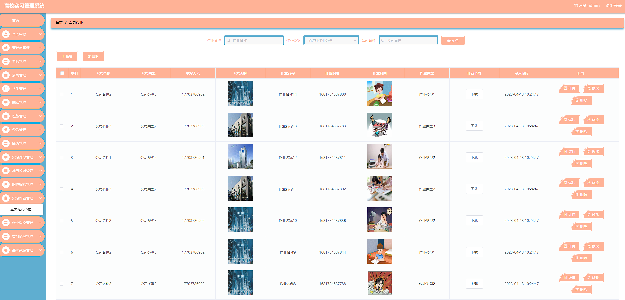 高校实习管理系统管理系统按照操作主体分为管理员和用户。管理员的功能包括班级管理、字典管理、公告管理、公司管理、简历管理、老师管理、实习评分管理、实习情况管理、简历投递管理、用户管理、院系管理、职位招聘管理、实习作业管理、作业提交管理、管理员管理。用户的功能等。该系统采用了Mysql数据库,Java语言,Spring Boot框架等技术进行编程实现。