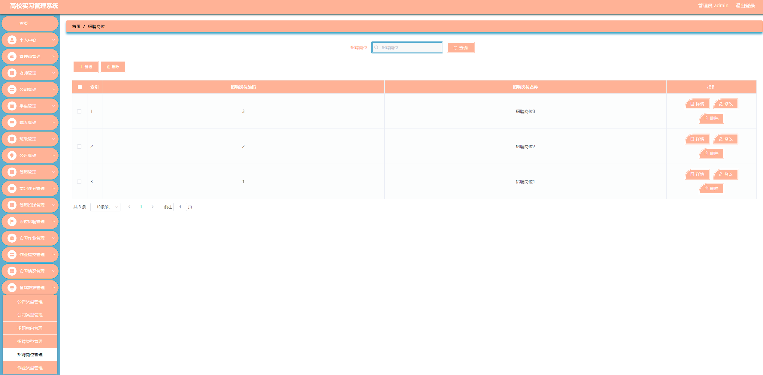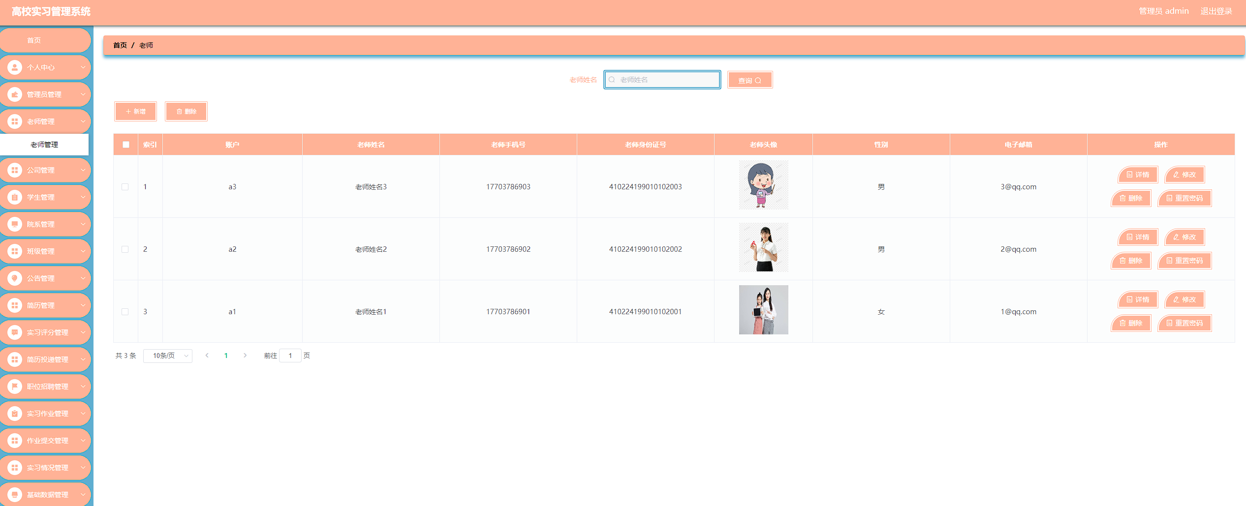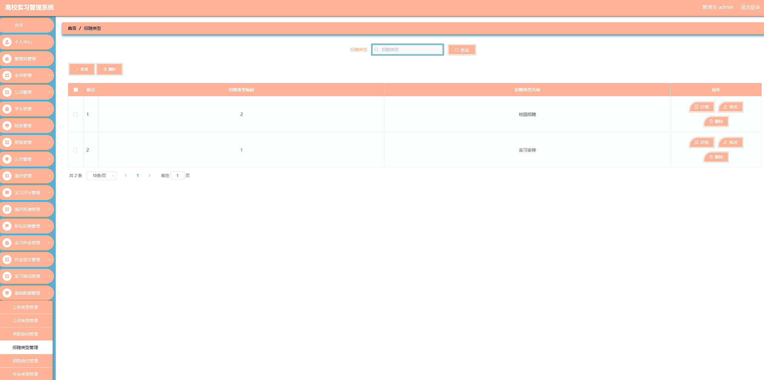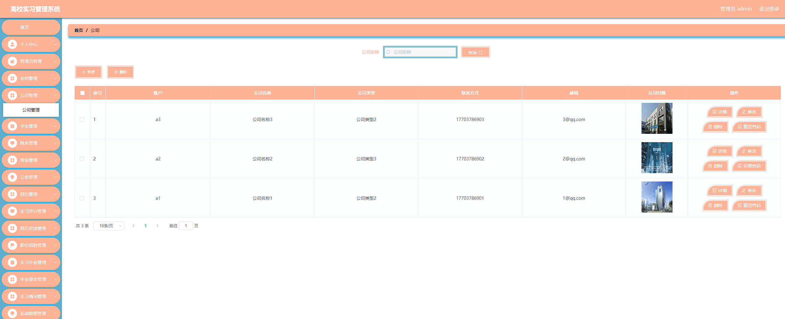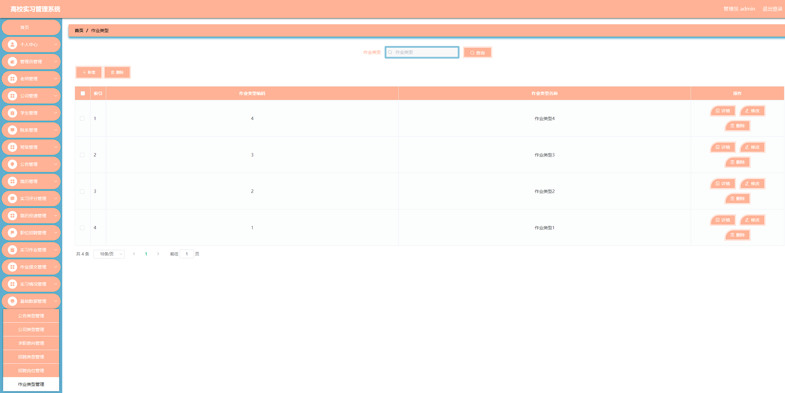 高校实习管理系统管理系统按照操作主体分为管理员和用户。管理员的功能包括班级管理、字典管理、公告管理、公司管理、简历管理、老师管理、实习评分管理、实习情况管理、简历投递管理、用户管理、院系管理、职位招聘管理、实习作业管理、作业提交管理、管理员管理。用户的功能等。该系统采用了Mysql数据库,Java语言,Spring Boot框架等技术进行编程实现。