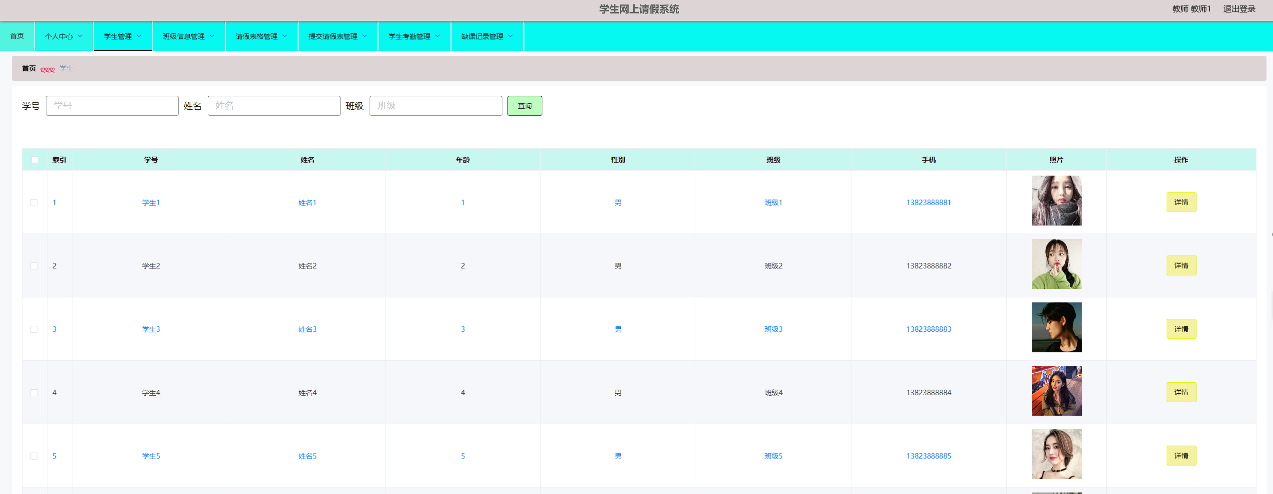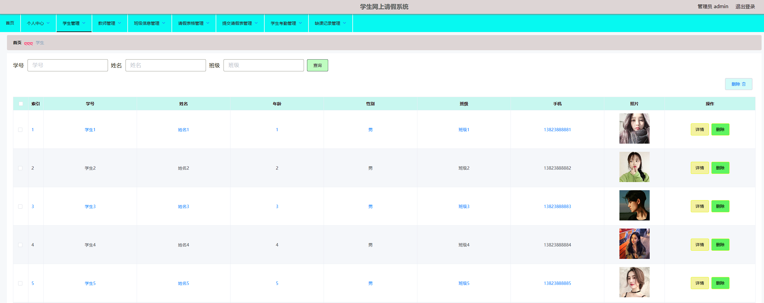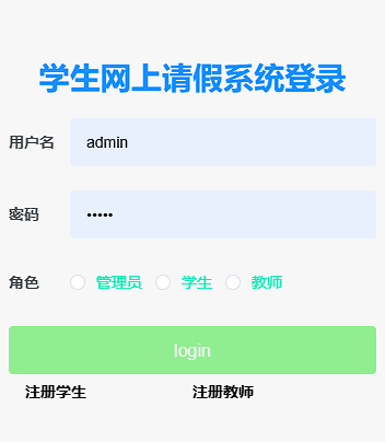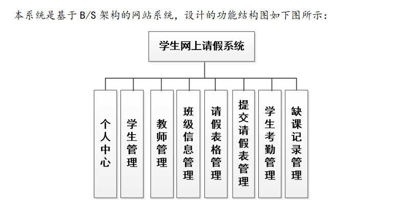 本学生网上请假系统管理员,教师,学生。管理员功能有个人中心,学生管理,教师管理,班级信息管理,请假表格管理,提交请假表管理,学生考勤管理,缺课记录管理。教师功能有个人中心,学生管理,班级信息管理,请假表格管理,提交请假表管理,学生考勤管理,缺课记录管理。学生功能有班级信息管理,请假表格管理,提交请假管理,学生考勤管理,缺课记录管理。因而具有一定的实用性。