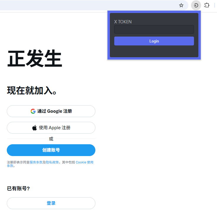 复制第五项,也就是token,然后访问推特官网,点击浏览器右上角打开先前安装的插件