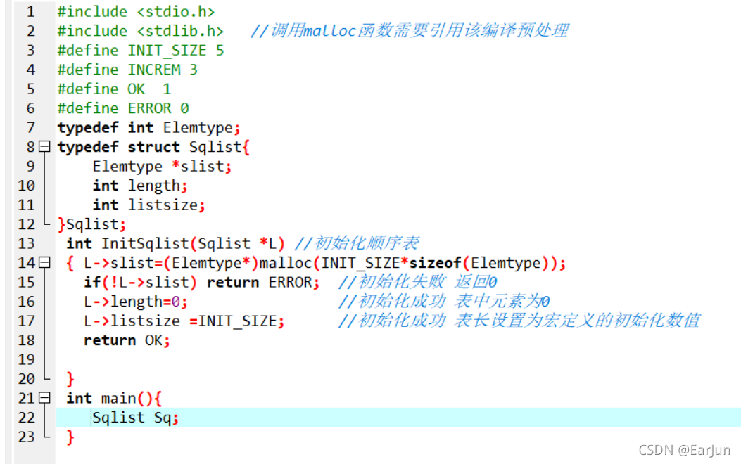 5行:使用指针变量 *slist原因:可变长顺序表便意味着系统给顺序表分配的空间可变,但当我们元素少时可能就分配一小块空间,要增加元素个数后面如果没有空间可分配,系统变会开辟一片新的连续存储空间 。这片空间我们不能给一个明确的名称,但是可以用一个指针变量指向这一块空间第一个元素的基地址